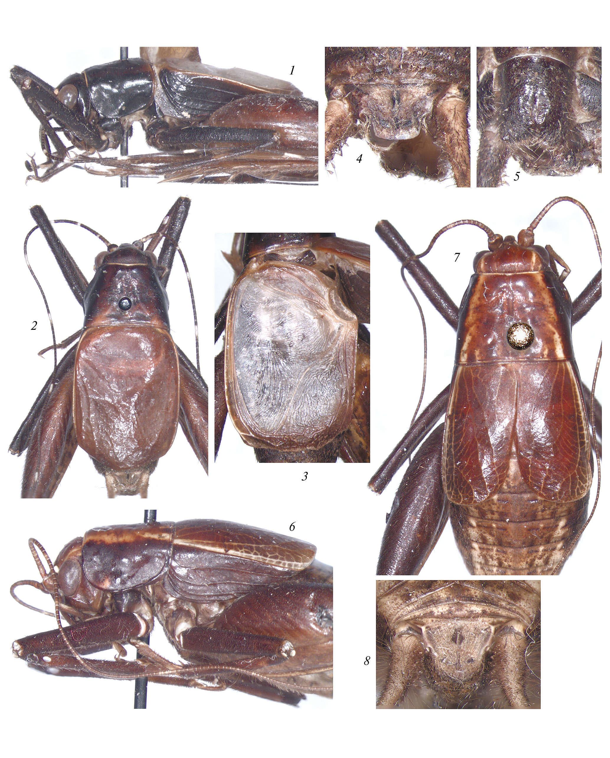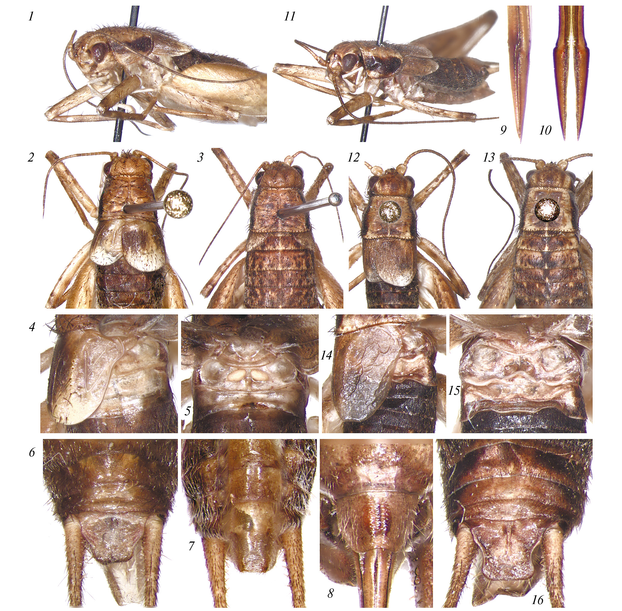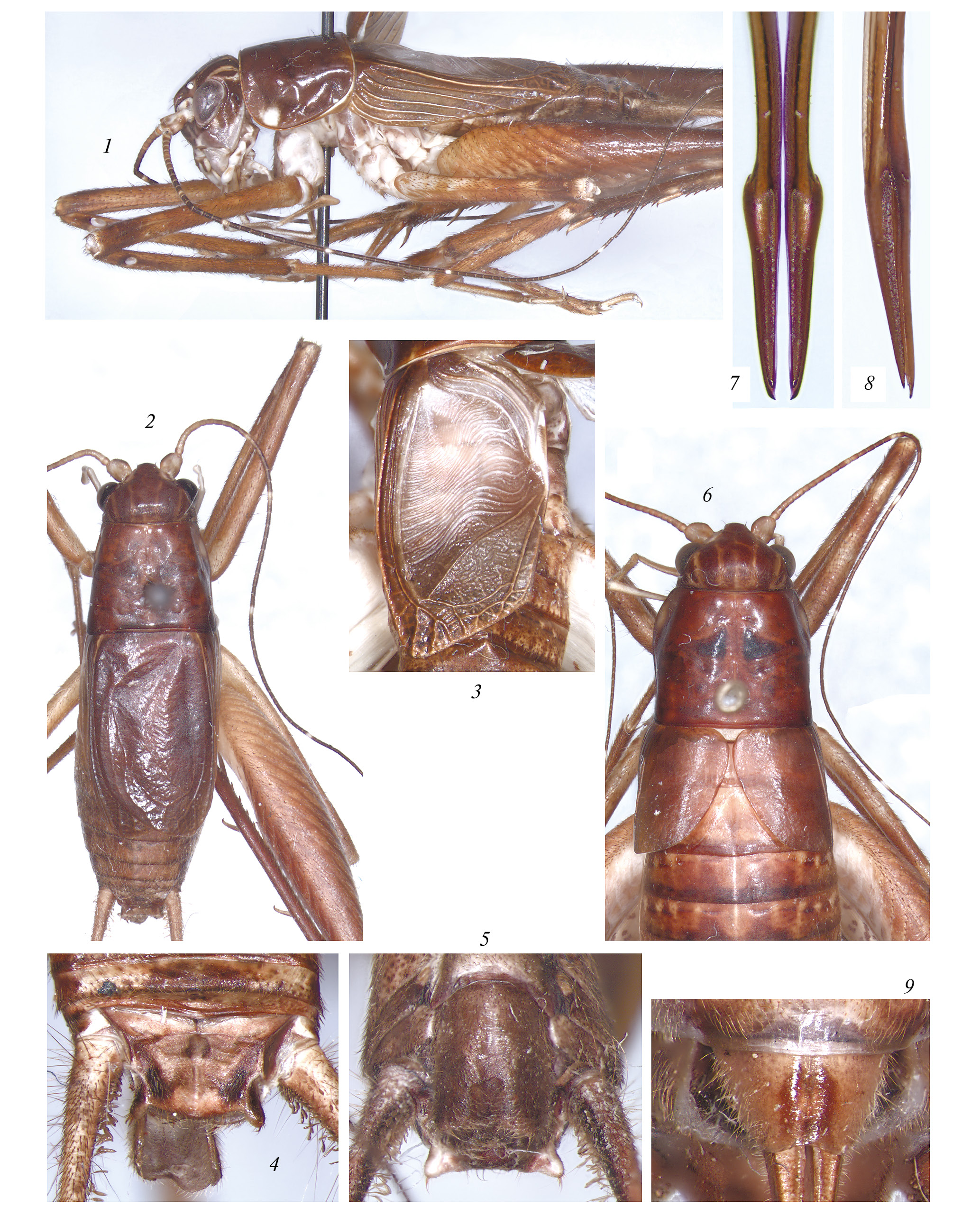Описание. Самец (голотип). Окраска довольно пестрая (рис. 6, 1–5): верхняя часть эпикраниума и переднеспинка рыжевато-коричневые с черноватыми щетинками и ободками вокруг глазков; глаза серо-коричневые; эпикраниум позади глаз коричневый, а ниже (под глазами, усиковыми впадинами и срединным глазком) темно-коричневый; наличник также темно-коричневый, но с мелкими светловатыми отметинами; остальные ротовые части светло-коричневые с желтоватыми и серо-коричневыми пятнами, но два дистальных членика максиллярных пальп белые; усики серо-коричневые со светло-коричневыми скапусами и педицелами; надкрылья желтоватые; видимые части средне- и заднегруди беловатые с очень светло-коричневой срединной частью заднегруди; ноги светло-коричневые с рыжеватым оттенком, немногочисленными и короткими косыми штрихами на наружных поверхностях задних бедер и почти серо-коричневыми вершинами этих бедер, а также вершинами задних голеней и дистальными участками на задних лапках; четыре передних тергита брюшка черные, а остальные брюшные тергиты серо-коричневые со светло-серо-коричневым срединным участком последнего тергита; стерниты и плейриты груди серовато-беловатые; стерниты брюшка коричневые; анальная пластинка светло-коричневая с коричневой вершиной; генитальная пластинка темно-коричневая; церки серо-коричневые со светловатыми основаниями. Голова незначительно у́же переднеспинки (рис. 6, 1); надкрылья относительно широкие, достигают основания первого тергита брюшка и с округленно обрубленными вершинами (рис. 6, 1–3); метанотум, анальная и генитальная пластинки – см рис. 6, 3–5; гениталии (рис. 6, 6–9) с удлиненным, полутрубчатым, немного расширенным в средней части и сужающимся к вершине склеритом из слившихся рахиса и формулы, а также с почти продольно прямоугольной передней частью этого склерита.