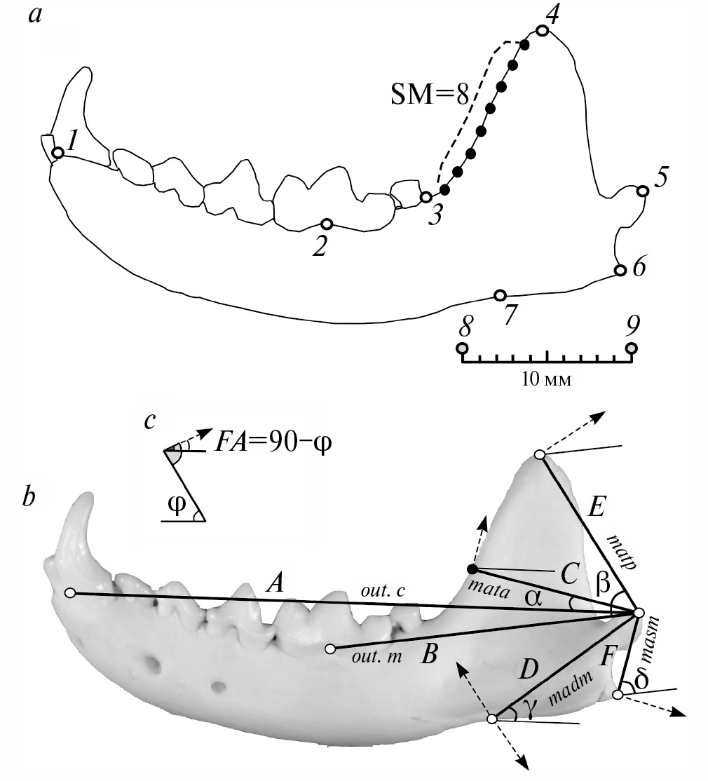 Рис. 1. Схема расположения на буккальной стороне мандибулы американской норки: a – ландмарок LM (1–7), полуландмарок SM (n = 8) и масштабирующих ландмарок (8, 9); b – промеров A, B, C, D, E, F (по: Gálvez-López, Cox, 2022) и углов α, β, γ, δ для вычисления индексов механических потенциалов клыка и хищного зуба (обозначения и пояснения см. в тексте) и c – способ вычисления угла направления силы – FA (по: Cornett et al., 2015). Стрелки – направления биомеханических сил внутренних плеч