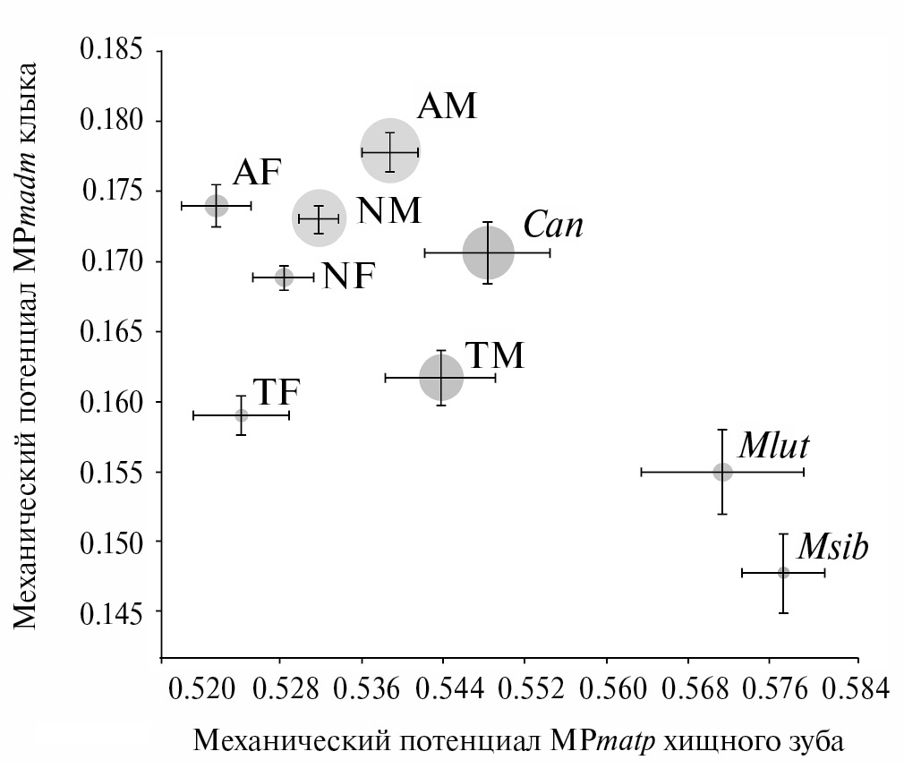Рис. 2. Сопоставление средних механических потенциалов (с учетом стандартной ошибки ± SE) клыка (MPmadm) и хищного зуба (MPmatp) самцов природной канадской популяции (Can), экспериментальных линий американской норки (агрессивные: самцы – AM, самки – AF; ручные: самцы – TM, самки – TF; неселектированные: самцы – NM, самки – NF), самцы европейской норки (Mlut) и колонка (Msib). Размеры теневых пятен соответствуют центроидным размерам (CS) за вычетом их минимального значения