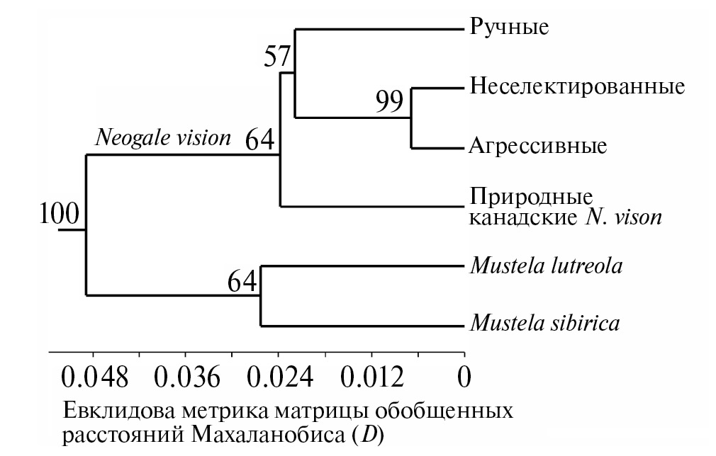 Рис. 3. Результаты кластерного анализа (UPGMA) средних индексов механического потенциала клыка и хищного зуба нижней челюсти особей канадской популяции, линий агрессивных, ручных и неселектированных американских норок (Neogale vison) и двух близких видов – европейской норки (Mustela lutreola) и колонка (M. sibirica)