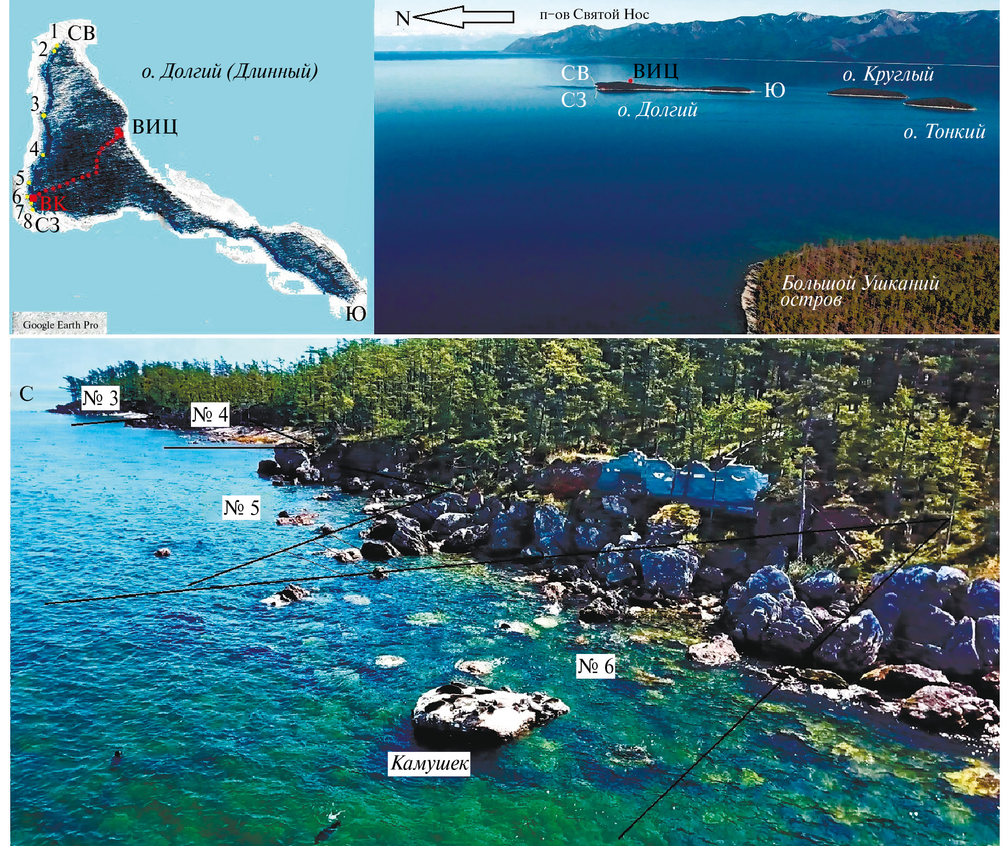 Рис. 1. Общий вид Малых Ушканьих островов (фото с БПЛА с высоты 110 м); о-в Долгий (Длинный) в плане (основа рисунка по: Google Earth pro) и ландшафт ≈450 м береговой линии северной стороны острова. ВИЦ – Визитно-информационный центр Забайкальского национального парка, красные точки – тропа к смотровой площадке; ВК – место установки стационарной видеокамеры (сектор ее обзора ≈260º); № 1–8 – локации фотоловушек; СВ, СЗ, Ю, С – мысы острова