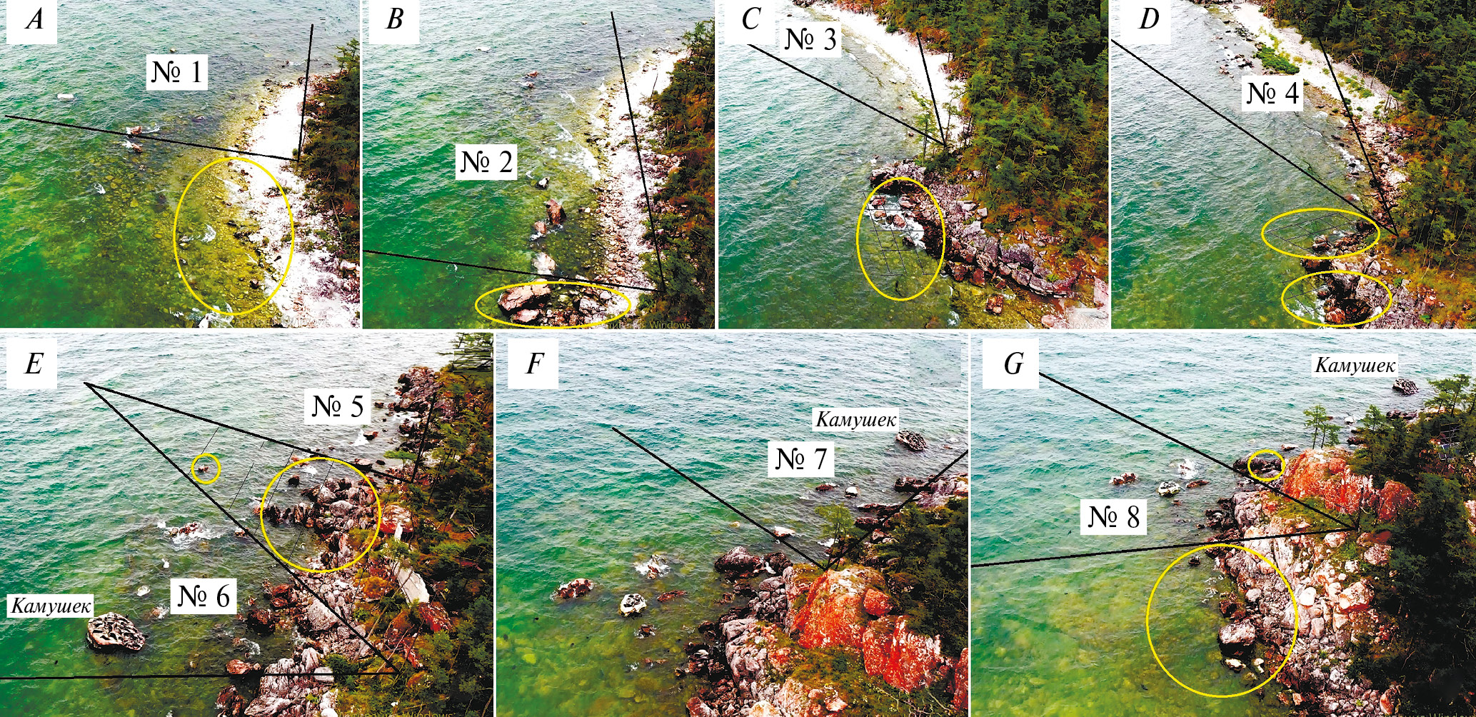 Рис. 2. Топография лежбищных участков и сектора наблюдения фотоловушек на о-ве Долгий. Северо-восточный мыс и северная сторона: A – лежбищный участок № 1 (53.86° с. ш., 108.72° в. д.); B – участок № 2 (53.86° с. ш., 108.717° в. д.); C – участок № 3 (53.859° с. ш., 108.716° в. д.); D – участок № 4 (53.860° с. ш., 108.714° в. д.); E – участтки № 5 (53.860° с. ш., 108.712° в д.) и № 6 (53.860° с. ш., 108.711° в. д.). Северо-западный мыс: F – лежбищный участок № 7; G – участок № 8 (53.860° с. ш., 108.711° в. д.). Желтыми окружностями обозначены локации, не попадающие в поле зрения фотоловушек (основа рисунков – фото с БПЛА с высоты 55–60 м, 2020 г.)