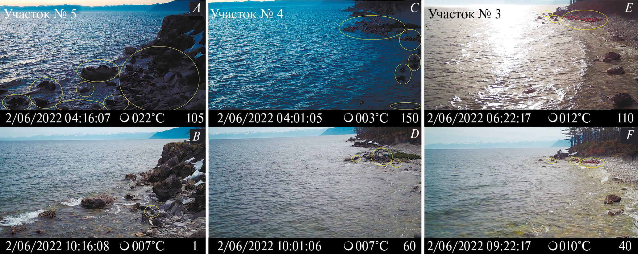 Рис. 3. Непогода 2 июня 2022 г. имела неодинаковые последствия для байкальских нерп, залегающих на участках №№ 5, 4 и 3 (покадровые подписи означают дату и время, температуру воздуха и количество нерп в кадре)