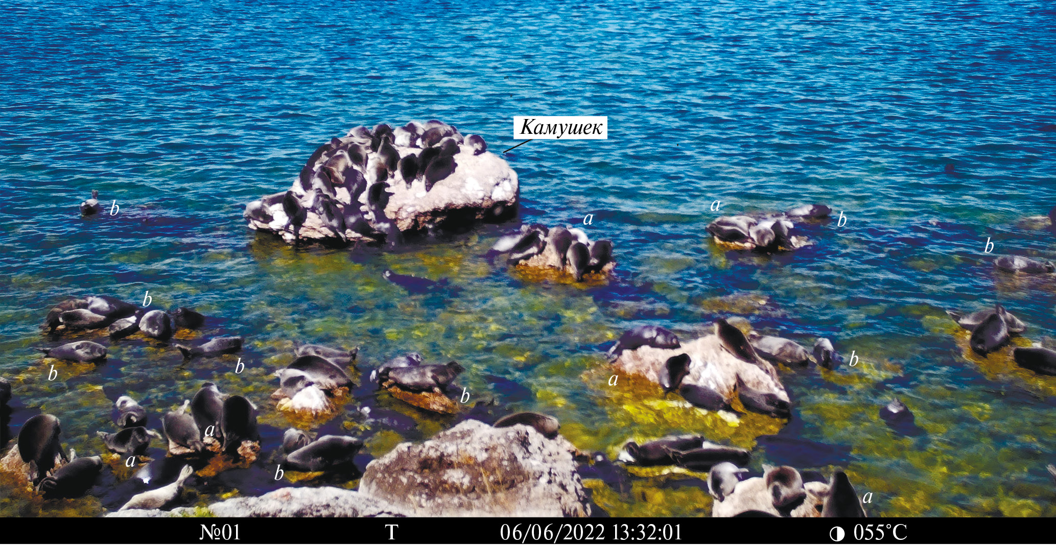 Рис. 4. Лежбищный участок № 6 на северо-восточном мысу о-ва Долгий: a – полузатопленные камни, b – выступающие над водой камни