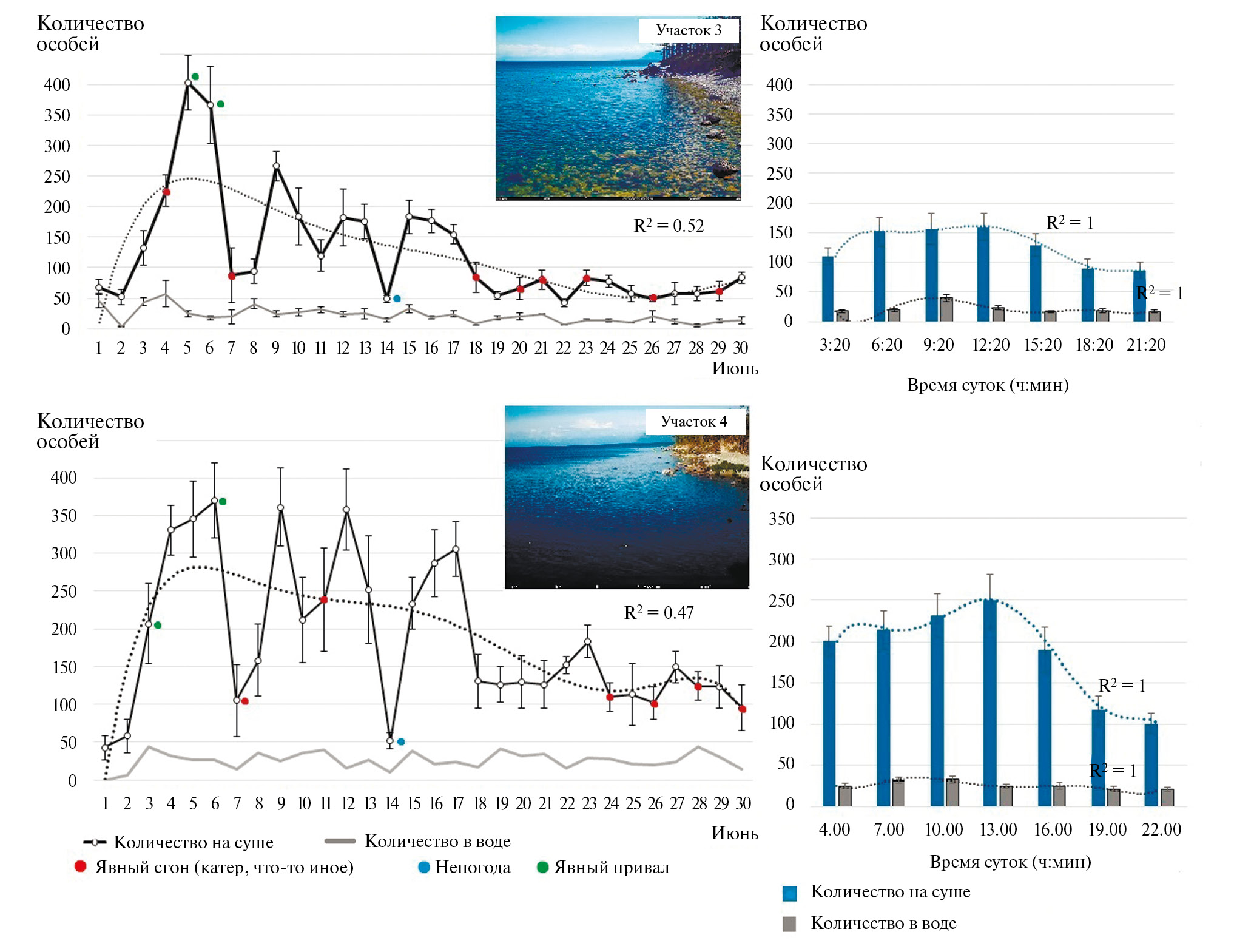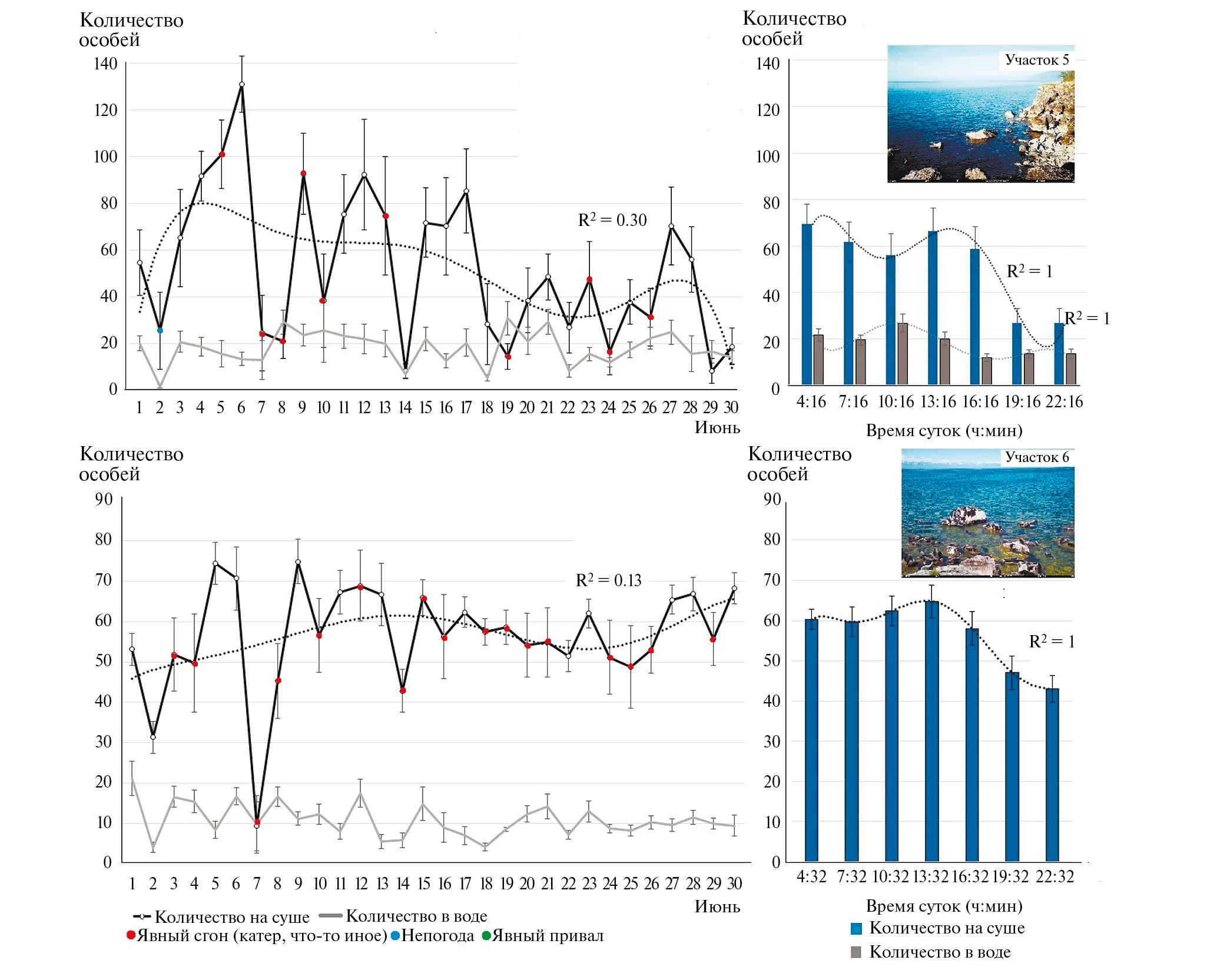 Временна́я динамика численности. Судя по полиномиальному тренду, динамика численности нерп в течение июня на участках № 1 и № 2 была схожей, за исключением отдельных моментов. Количество зверей быстро увеличивалось и достигло пика 4–6 июня. Но 5 июня на участке № 1 численность резко сократилась, восстановившись на следующий день (рис. 5). Этот “провал” в графике возник из-за катера, который прошел слишком близко к мысу и спугнул значительную часть залежки. Второе резкое падение численности произошло 7 июня: в 12–13 ч все звери покинули оба участка и в этот день уже не вернулись (смотрите ниже). На следующий день численность зверей на первом участке так и не восстановилась, а на втором – напротив, произошел привал и в 9 ч 30 мин на нем лежали >220 нерп. Заметим, что 7 июня на Байкале наблюдалось волнение силой в 3–4 балла (“с беляком”) и, хотя волна затрагивала только первое лежбище и то косвенно, непогода могла отразиться на поведении нерп. Дальнейшая динамика численности зверей была схожей: достигнув максимума 4–6 июня, она стала уменьшаться и во второй декаде июня сократилась в среднем в 2 раза. В третьей декаде произошло второе двукратное сокращение средней численности, к концу месяца она уменьшилась на первом участке до нуля, на втором – до 60–70 (рис. 5). Максимальное количество зверей на суше на первом лежбище отмечено 4 июня (150 особей), а на втором – 6 июня (390 особей, из них 300 – непосредственно на пляже).