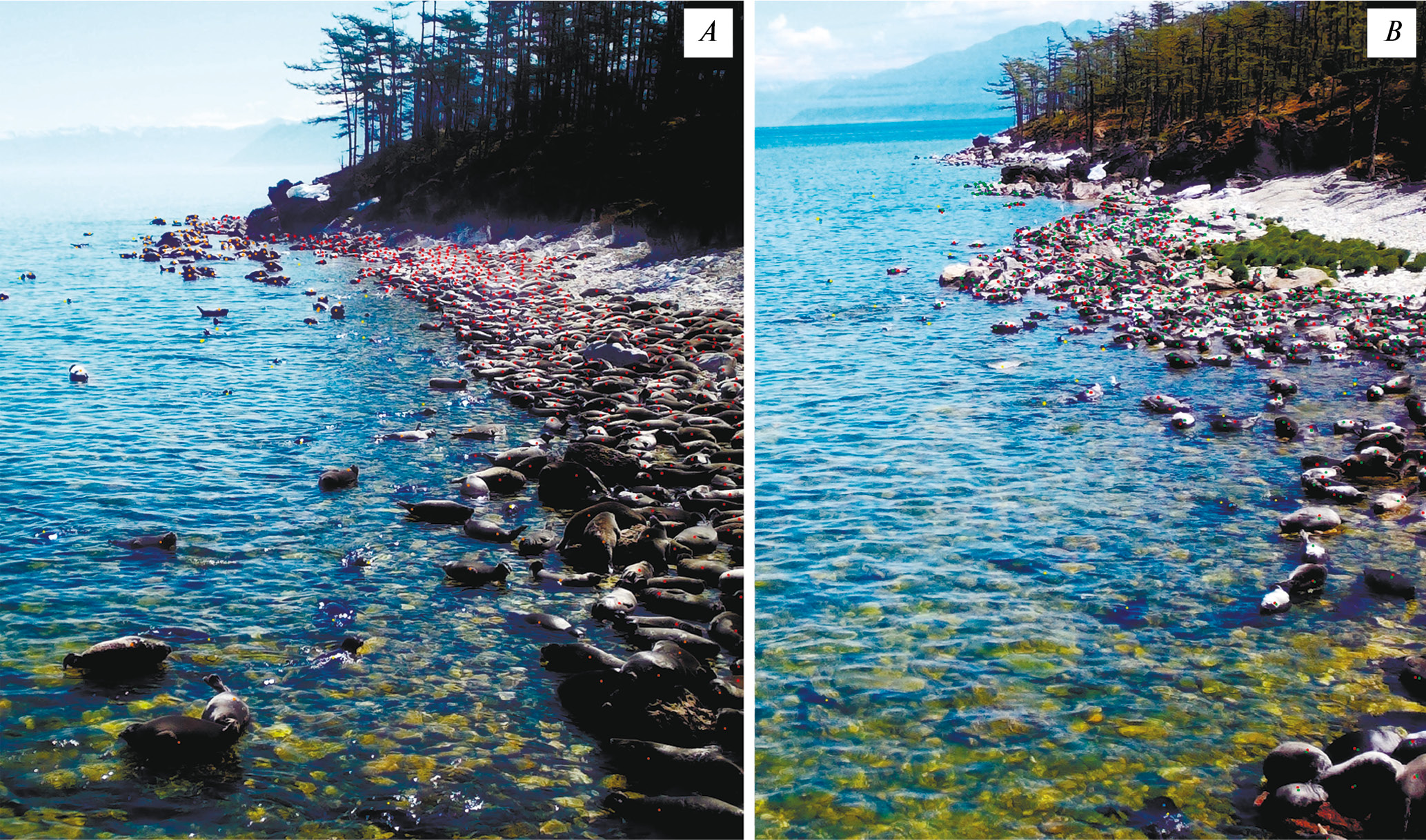 Рис. 7. Численность байкальских нерп 6 июня 2022 г.: A – на лежбищном участке № 3 (в 9 ч 22 мин), B – на участке № 4 (13 ч 22 мин). Обратите внимание на температуру воздуха (ºС)