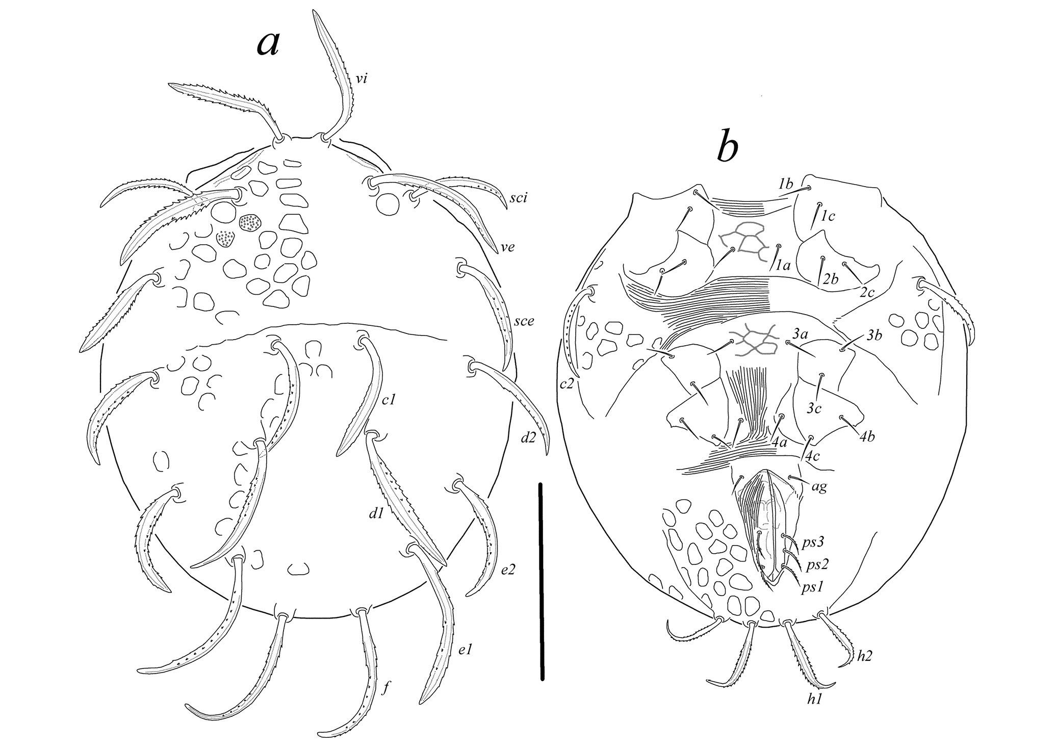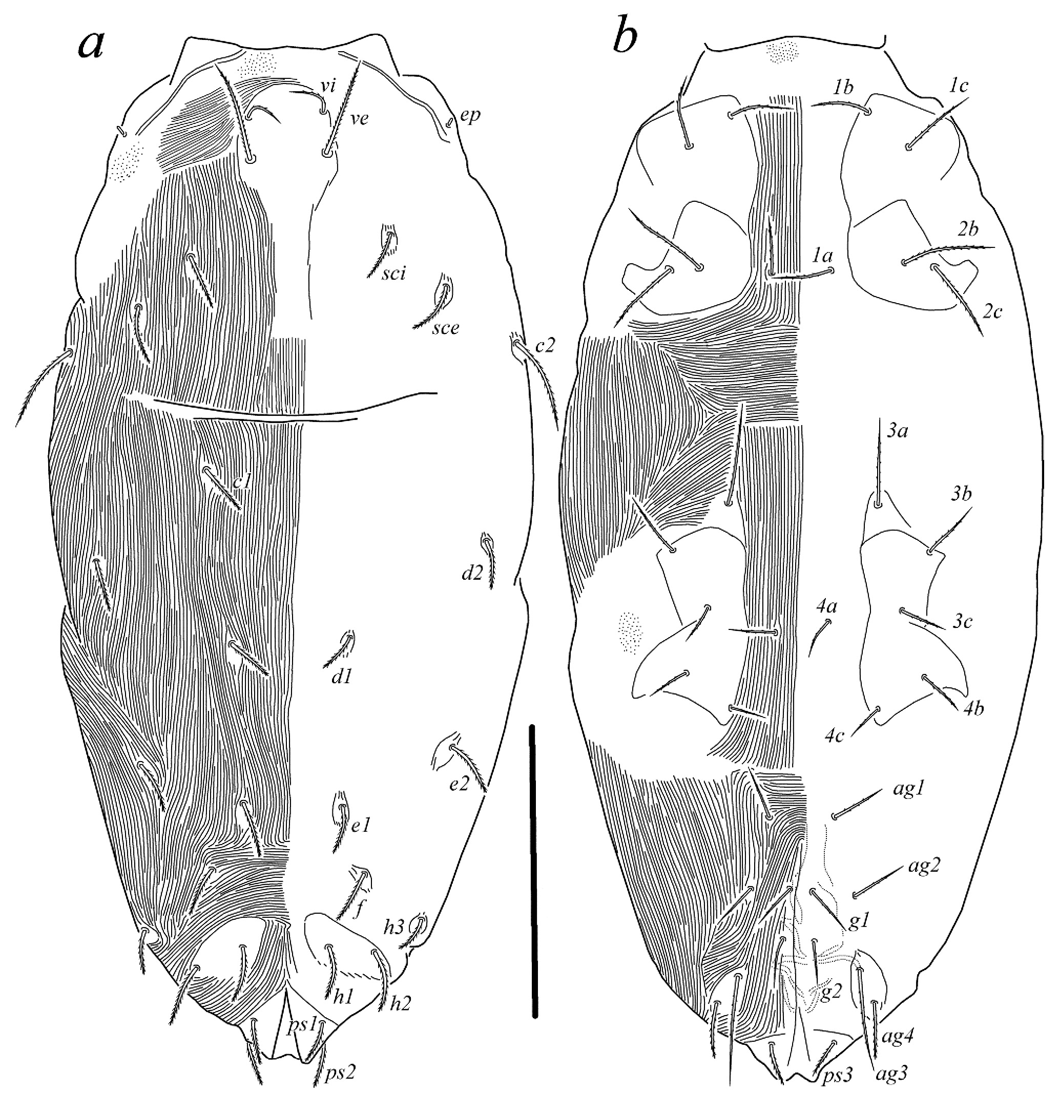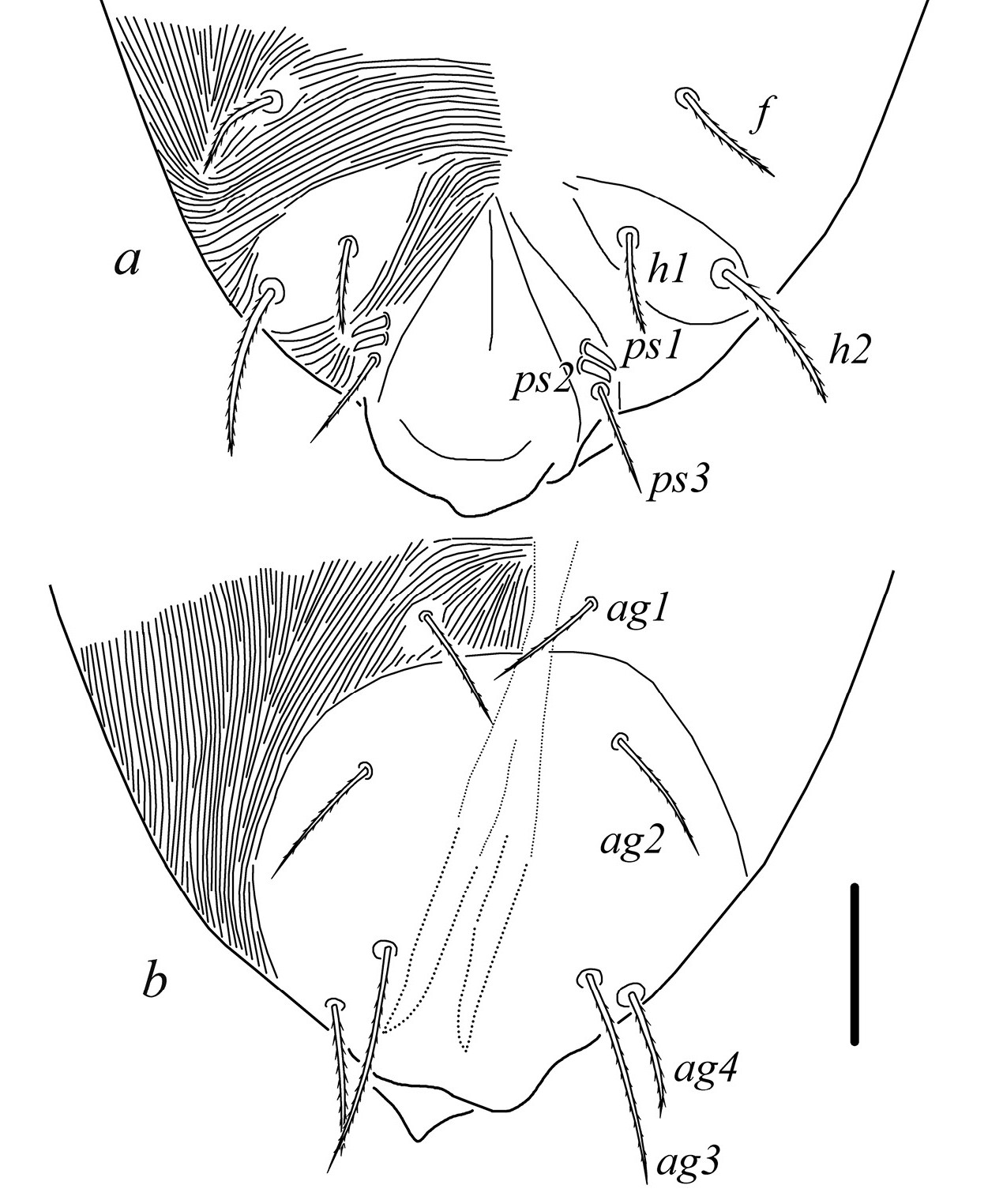 Idiosomal venter (Fig. 1b). All ventral plates smooth; four pairs of aggenital setae, setae ag3 and ag4 located on small plates; two pairs of genital setae. All ventral setae weakly barbed, setae ps1–ps3 and ag4 weakly blunt-tipped, other ventral setae pointed. Setae 3a located on small endopodal plates; setae 4a situated on striated cuticle. Cuticle just posteriad gnathosoma and laterad bases of legs I-II and III-IV with tubercles. Lengths of ventral setae: 1a 21, 1b 22, 1c 27, 2b 32, 2c 29, 3a 33, 3b 22, 3c 17, 4a 17, 4b 15, 4c 14, ag1 21, ag2 21, ag3 42, ag4 20, g1 17, g2 17, ps1 16, ps2 16, ps3 15.