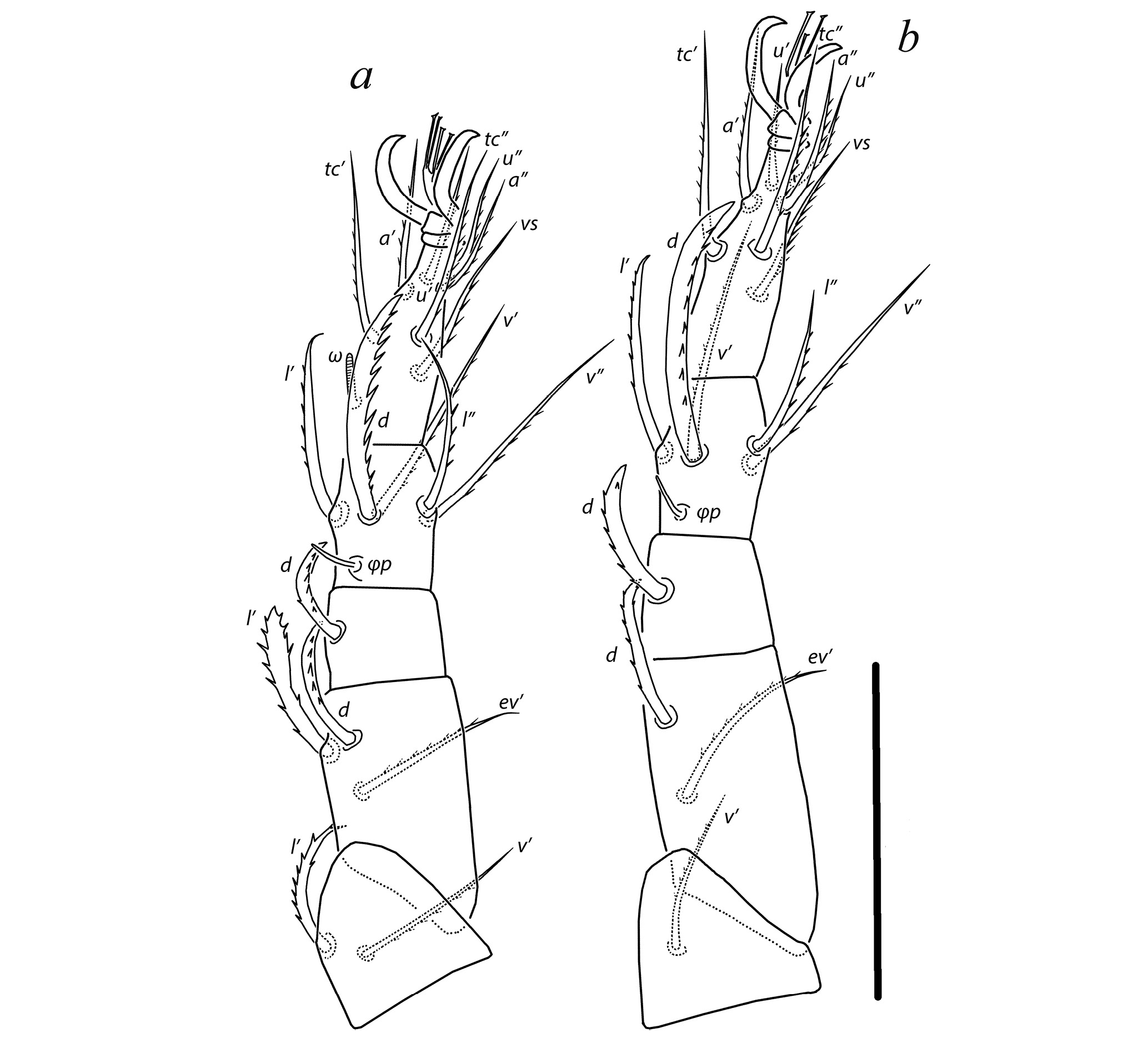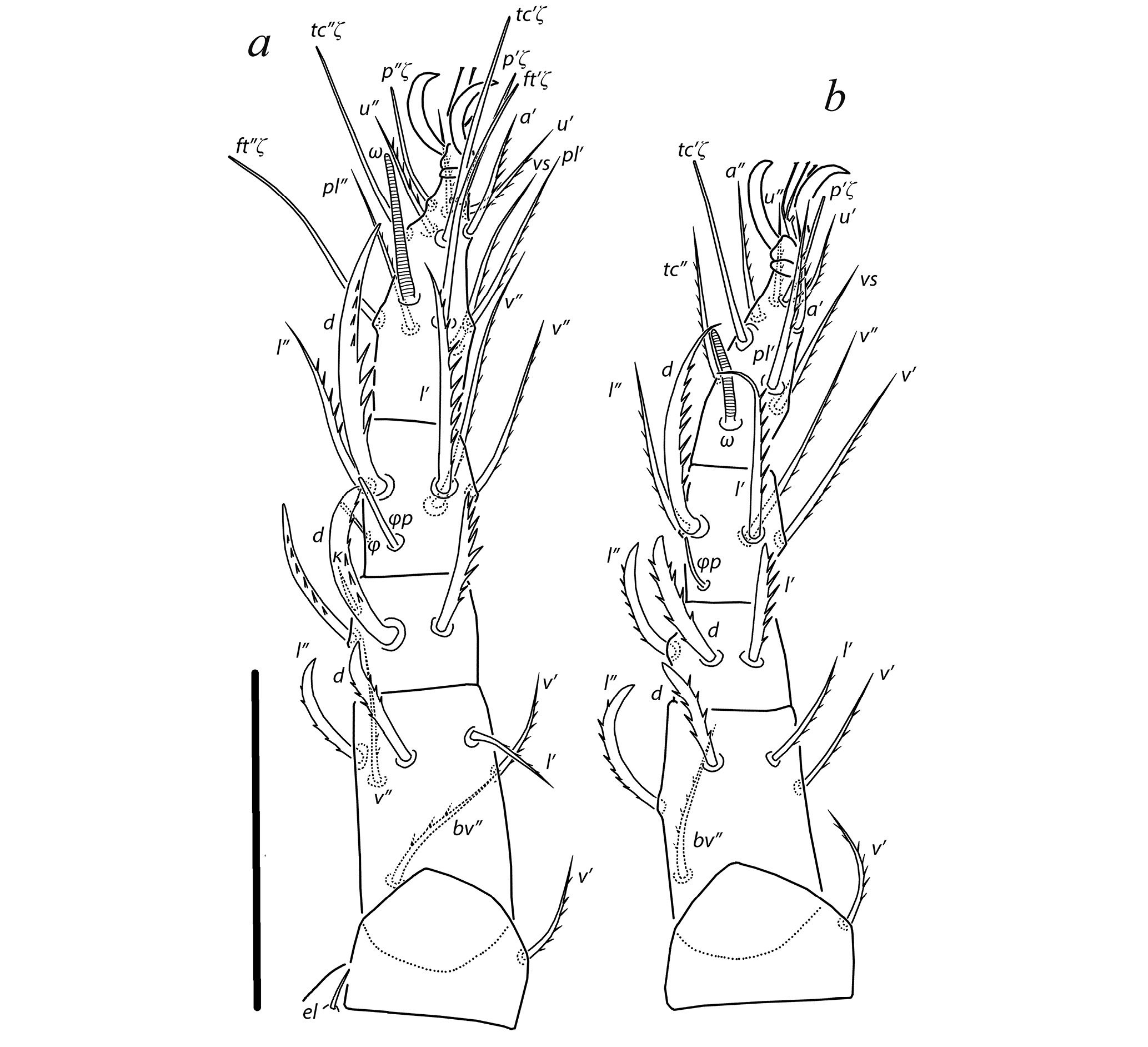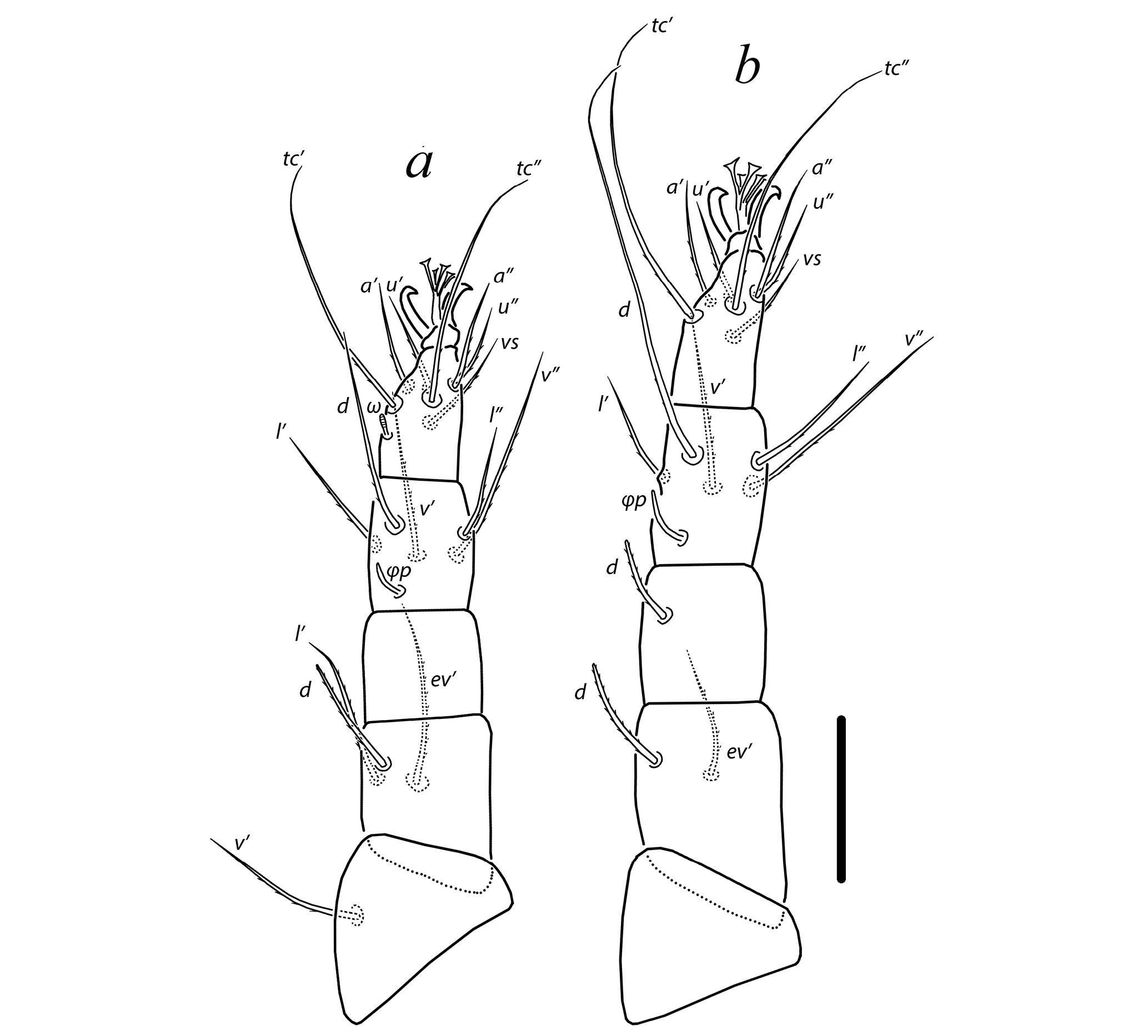 Seta k 7 of genu rod-like, slightly asymmetric; other setae (except eupathidia) pointed and weakly barbed. Solenidion ω 10 digitiform; solenidion φp 17 uniformly thin. Leg III (Fig. 3a). Leg setation: Tr 2 (l′, v′), Fe 3 (d, l′, ev′), Ge 2 (d, v′), Ti 5 (1) (d, l′, l″, v′, v″, φp), Ta 8 (1) (tc′, tc″, u′, u″, a′, a″, vs′, vs″, ω). Solenidion ω 7 baculiform; solenidion φp 15 uniformly thin. All leg setae pointed and barbed. Leg IV (Fig. 3b). Leg setation: Tr 1 (v′), Fe 2 (d, ev′), Ge 2 (d, v′), Ti 5 (1) (d, l′, l″, v′, v″, φ), Ta 8 (1) (tc′, tc″, u′, u″, a′, a″, vs′, vs″, ω). Solenidion ω 6 baculiform; solenidion φp 15 uniformly thin. All setae pointed and barbed.