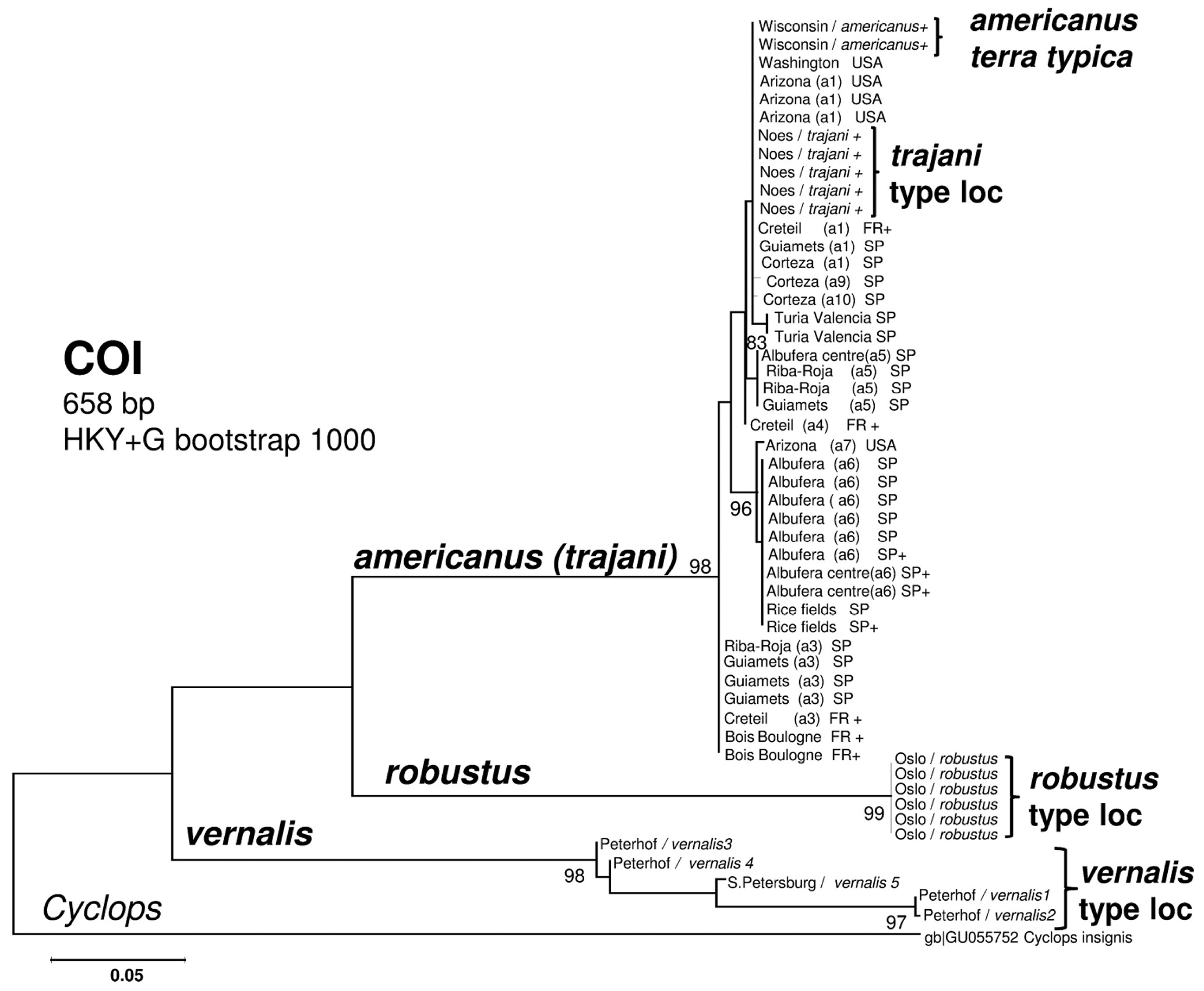 Для исправления новосозданного хаоса были объединены усилия международного коллектива систематиков из четырех стран с двух континентов и были применены методы молекулярной генетики (Miracle et al., 2013). Из типовых мест обитания были собраны подробно описанные здесь представители ранее известных европейских видов (A. vernalis из пруда в Петергофе, Россия, A.robustus из озера близ Осло в Норвегии). В добавление к ним в молекулярно-генетическом тесте участвовали и вновь описанные таксоны указанных авторов, собранные из типовых мест обитания, а также взятые из Genbank. Для сравнения с американским вселенцем профессор Стенли Додсон незадолго до своей трагической гибели прислал нам пробу зоопланктона из водоемов в штате Висконсин, США (типовой водоем для A. americanus, на котором работал в свое время Марш) и из некоторых других водоемов на юге США (штат Аризона). Проба из Висконсина содержала большое количество половозрелых особей рода Acanthocyclops, которые относились к одному виду и соответствовали описанию Марша (Marsh, 1893), что позволило определить их как A. americanus. Проведенное в университете Валенсии (Испания) молекулярно-генетическое сравнение образцов внесло определенную ясность в этот вопрос (рис. 9).