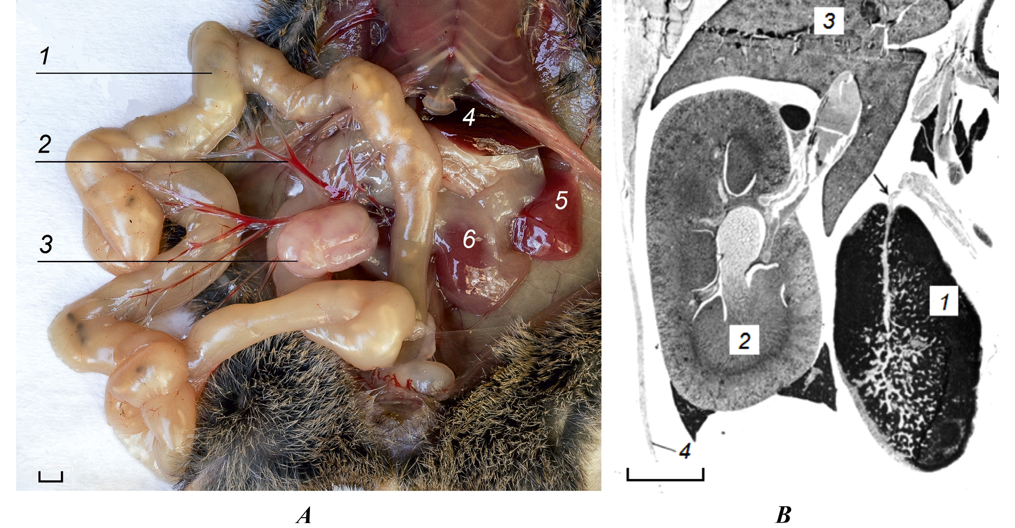 Рис. 1. Большой брыжеечный лимфатический узел S. araneus: А – вид снаружи (1 – кишечник, 2 – брыжейка, 3 – ББЛУ, 4 – печень, 5 – селезенка, 6 – левая почка), фото авторов; B – парасагиттальный разрез верхней части живота (1 – большое лимфоидное тело (ББЛУ), стрелка указывает на его главную артерию; 2 – правая почка; 3 – печень; 4 – спинная стенка брюшной полости), цит. по: Holmes, 1965. Масштаб 1 мм.