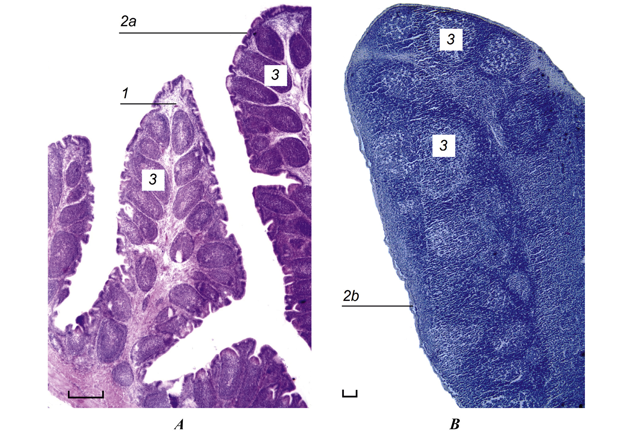 Рис. 2. Микроструктура фабрициевой сумки Gallus gallus (А) и большого брыжеечного лимфатического узла S. araneus (В): 1 – участок складки фабрициевой сумки; 2а – поверхностный (цилиндрический) эпителий; 2b – соединительнотканная капсула; 3 – фолликулы, гематоксилин-эозин, фото авторов. Масштаб 100 мкм.
