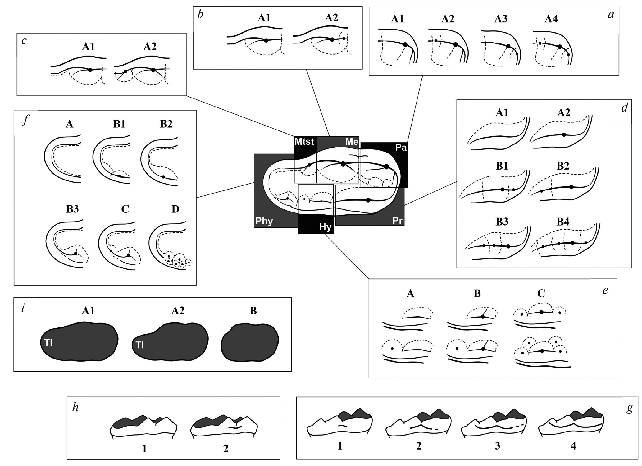 Рис. 1. Морфотипы М2 бурого и белого медведей (название элементов зуба см. табл. 1). Части зуба: a – паракон (Pa), b – метакон (Me), c – метастиль (Mtst), d – протокон (Pr), e – метаконуль (Mtcl), f – постметаконуль (Pmtl), h – буккальный цингулюм (в баллах), g – лингвальный цингулюм (в баллах), i – форма окклюзиальной поверхности (Tl – талон).