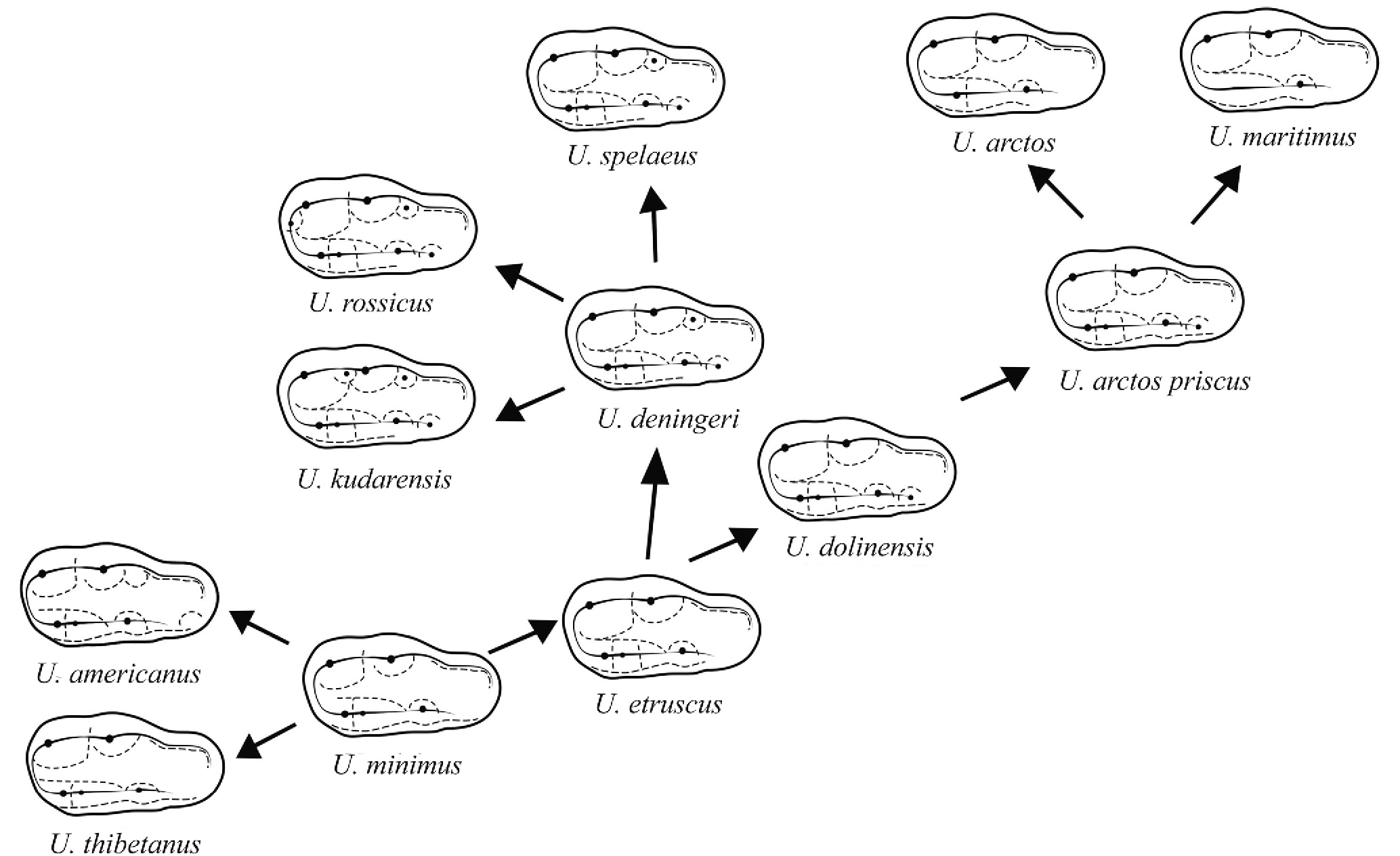 Рис. 3. Эволюционные преобразования М2 в роде Ursus.