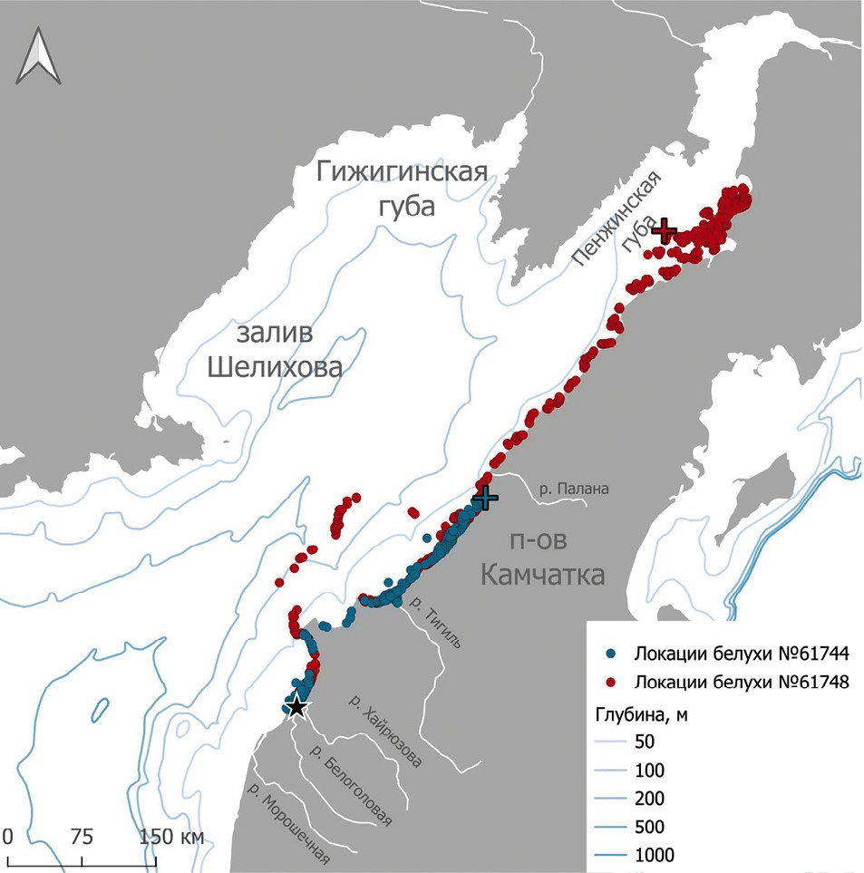 Все три белухи на протяжении безлёдного осеннего периода (август–сентябрь) оставались в акватории у западного побережья Камчатки, включая залив Шелихова. Льдообразование здесь началось в 2010 г. в середине ноября, в 2011 г. – в первых числах ноября. Самцы до начала льдообразования регистрировались в прибрежной акватории, перемещаясь между устьями крупных рек на незначительном удалении от места мечения. Самка провела в заливе Шелихова только сентябрь, а к октябрю переместилась севернее, в Пенжинскую губу. При продвижении белух на север самка, в отличие от самцов, обходила мыс Южный на значительном удалении от берега. Самец № 110720, помеченный в сентябре 2011 г., переместился в акваторию Пенжинской губы только после того, как припайный лед начал образовываться вдоль западного побережья Камчатки. По мере заполнения льдом залива Шелихова самец отходил дальше от берега и перемещался в более южные районы, оставаясь преимущественно на небольших глубинах (до 150 м). Только в марте 2012 г., в период максимального развития и толщины ледового покрова в акватории, он переместился к центру залива Шелихова на бόльшие глубины (>250 м).