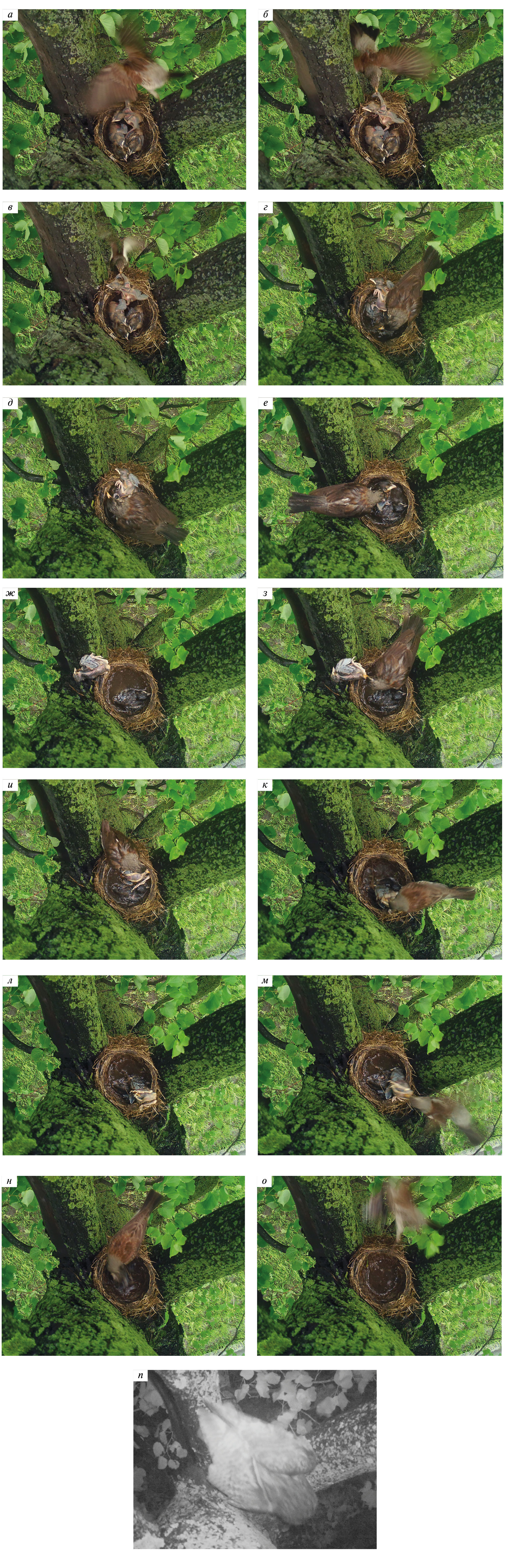 Все же из-за непогоды в одном из этих трех гнезд (в третьей декаде апреля в полной кладке было пять яиц), располагавшемся на высоте 9 м (фотоловушка была установлена 25 апреля в 1.0 м над гнездом) в развилке ствола дуба черешчатого (Quercus robur) на территории спорткомплекса (55°42ʹ07.2ʺN, 37°32ʹ12.1ʺE), менее чем за сутки – с утра 8 мая до ночи на 9 мая – погибли четыре из пяти птенцов ~7–8-суточного возраста (рис. 3а–3о). Два птенца умерли 8 мая между 8:00 и 10:00, третий – между 11:15 и 12:30 (рис. 3а), еще один – в ночь на 9 мая. Однако все четыре погибших птенца оставались в гнезде до позднего утра 9 мая (рис. 3б): один был вынесен самкой в 10:37 (рис. 3в, 3г; дополнительный материал: Видео 1), другой – в 10:45 (рис. 3д, 3е; дополнительный материал: Видео 1), третий – в 11:05, четвертый (умерший третьим по счету) – между 14:10 и 14:19. Пятый, обессилевший птенец погиб в возрасте ~9– 10 суток либо вечером (после 17:40) 9 мая, либо 10 мая (видеозаписи не дают возможности установить время смерти точнее). Одной из причин его ослабления и смерти, наряду с прямым воздействием погодных условий, судя по всему, стало “неадекватное” поведение самки. Самец в период с 7 мая до гибели последнего птенца вел себя нормально, а именно приносил дождевых червей (преимущественно – довольно крупных) и либо кормил (или пытался кормить ослабевших) птенцов сам, либо передавал червей для птенцов самке.