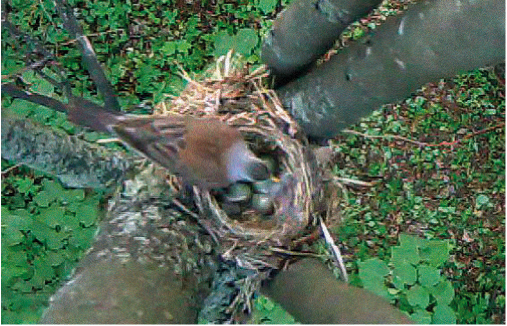 Гнездо № 2018–143–108. Студенческая автопарковка МГУ, 55°42ʹ11.7ʺN, 37°32ʹ24.8ʺE, на живом дубе черешчатом, высота расположения гнезда 4.3 м, расстояние камеры от гнезда 1.1 м. Рассчитанная дата откладки первого яйца. 26 мая 2018 г. Хищник, напавший на гнездо. Сойка. Дата и время нападения. 3 июня в 12:42. Интенсивность обороны гнезда родителями. Не обороняли: самка покинула гнездо за 1.6 мин до появления сойки, и действия последней, похоже, не были замечены (отлучившимися?) родителями (Рис. 8а; Дополнительный материал: Видео 8). Что/кого уничтожил хищник? Полная кладка из четырех яиц на средней стадии насиживания (уничтожена за ≤2.6 мин). Оставленные хищником “следы”. В лотке – скорлупа с остатками содержимого, в том числе очень крупные фрагменты (>> половинок), возможно, всех четырех яиц (Рис. 8б; Дополнительный материал: Видео 8). Уничтожение следов разорения родителями и сопутствующие действия. В течение ~2 мин между 12:47 и 12:50 минимум в четыре приема взрослая птица (похоже, во всех случаях самка) съела на месте часть остатков содержимого и, видимо, скорлупы, а самые крупные фрагменты скорлупы вынесла из гнезда (Рис. 8б; Дополнительный материал: Видео 8). В 12:53 самка уселась в пустое гнездо и, поначалу покрутившись, просидела в нем ~4.7 мин. Итог очистки гнезда одним/обоими родителями и его насиживания самкой, затраченное на это время. Следов нападения, по всей видимости, не осталось уже через ~6 мин после исчезновения хищника: к 12:50, лоток, похоже, был очищен от скорлупы, и беспорядка в гнезде не наблюдалось, а к 12:58 (после нескольких минут насиживания самкой пустого гнезда) – тем более.