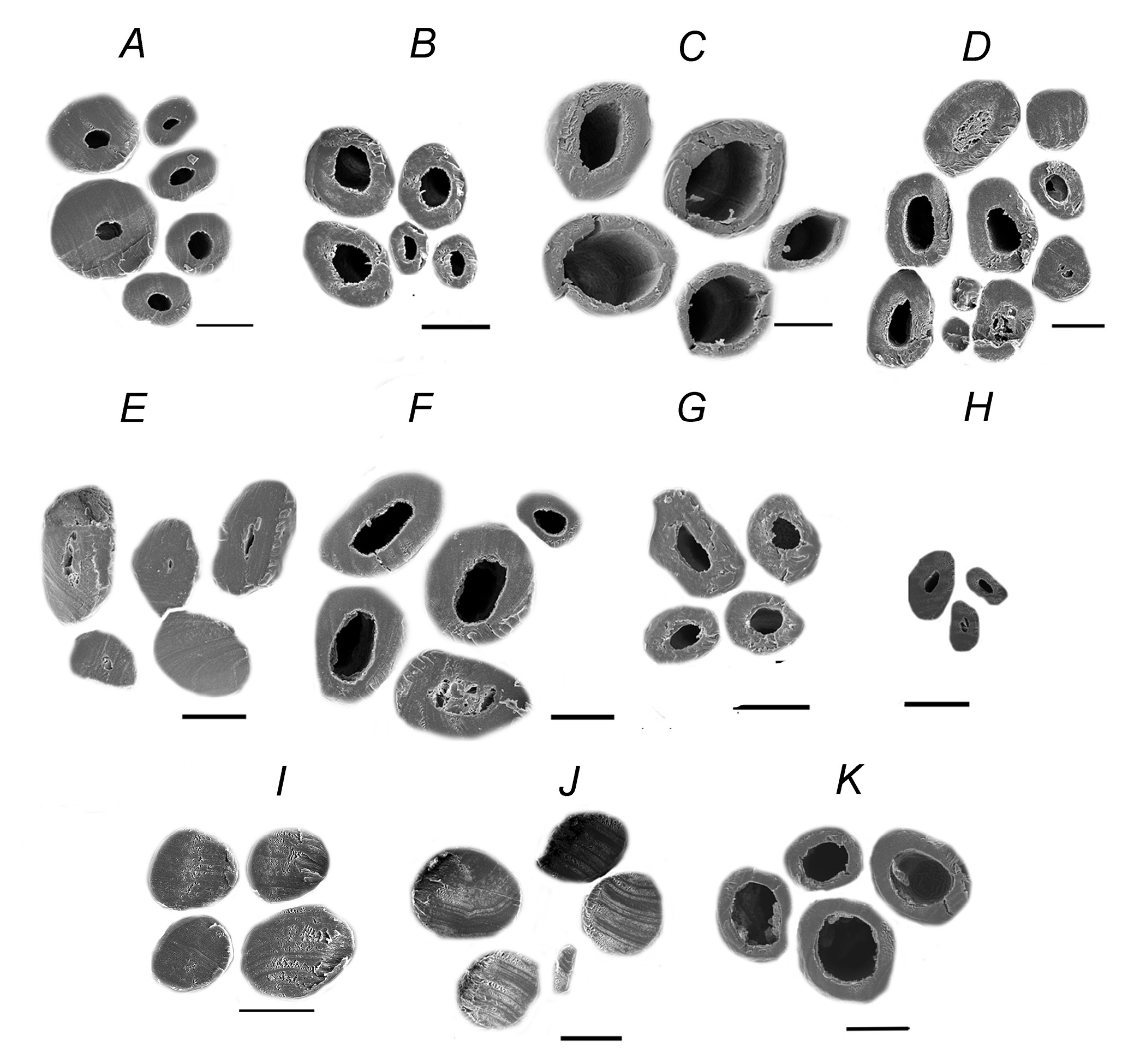 Рис. 3. Поперечные сечения волос из разных участков тела взрослого самца плейстоценового волка (Canis lupus ssp.): A – морда, B – ухо, C – спина, D – бок, E – грудь, F – брюхо, G – бедро, H – голень, I – кисть, J – стопа, K – хвост. Данные СЭМ. Масштаб 50 мкм.