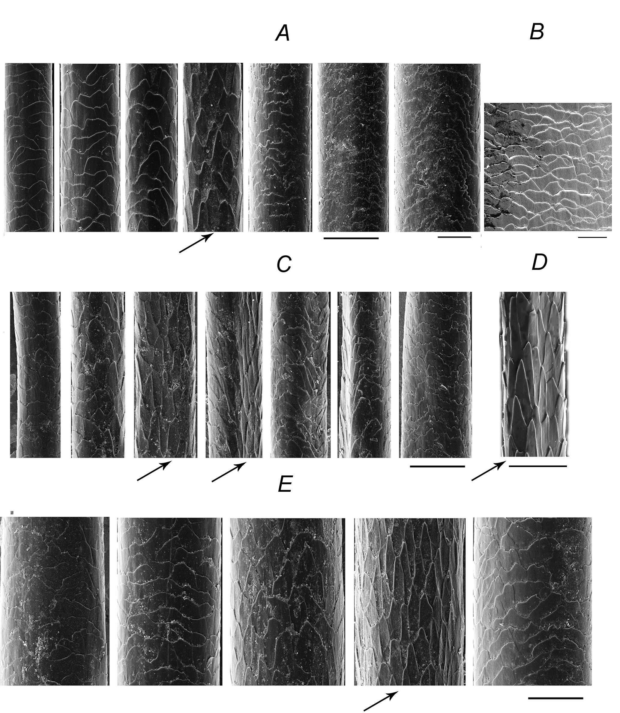 Для изучения волос в CЭМ мы использовали общепринятую методику (Соколов и др., 1988). Самую крупную вибриссу и наиболее толстые остевые волосы (размерная категория – ость I) из разных участков тела волка (морда, ухо, спина, крестец, бок, грудь, брюхо, бедро, голень, хвост) очищали в шампуне, промывали в дистиллированной воде, проводили через спирты возрастающей концентрации (от 30 до 100%) и ацетон, высушивали в критической точке на установке Hitachi Critical Point Dryer HCP-1 (Япония). Далее образцы напыляли золотом в вакууме на установке S150A Sputter Coater (Edwards, Великобритания). Препараты изучали в растровом электронном микроскопе Vega TS5130MM (Tescan, Чехия), получая электронные изображения орнамента кутикулы на тотальных препаратах и микроструктуры волос на поперечных и продольных сечениях основания и расширенной срединной части (гранна, “shield”, анг.) стержня. Элeктронные изображения редактировали в программе “Adobe Photoshop Element 11” (США), но изменения касались лишь их компоновки, яркости и контраста. Полученные данные анализировали в программе “ImageJ” (Abramoff et al., 2004); морфометрические данные статистически обрабатывали и представляли в графической форме с помощью программы “STATISTICA 10” (США).
