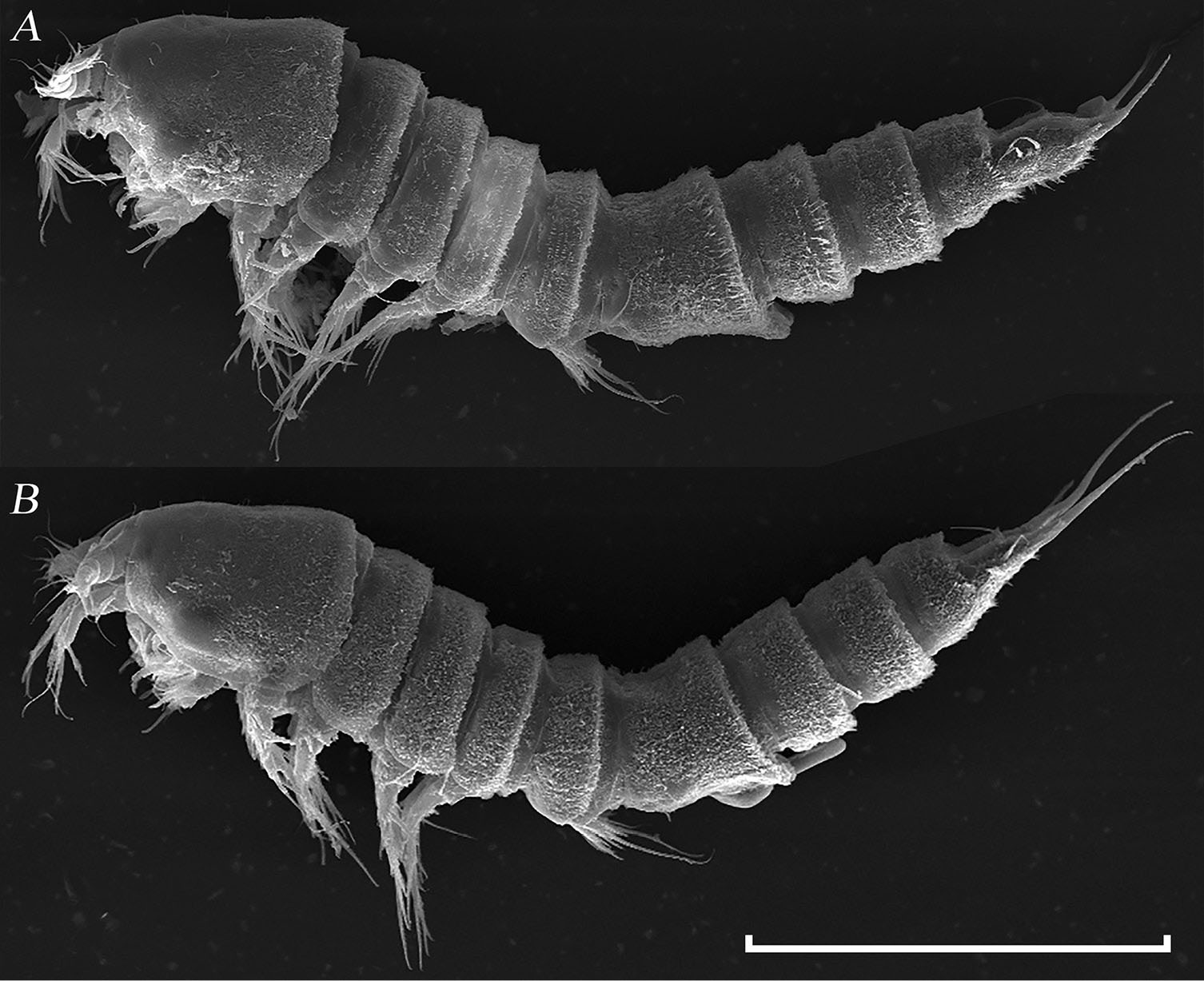Рис. 1. Moraria (Baikalomoraria) okunevae sp. n. (A) и Moraria (Baikalomoraria) ornofurcata sp. n. (B), СЭМ-фотографии внешнего вида самок, латерально. Масштаб 300 мкм.