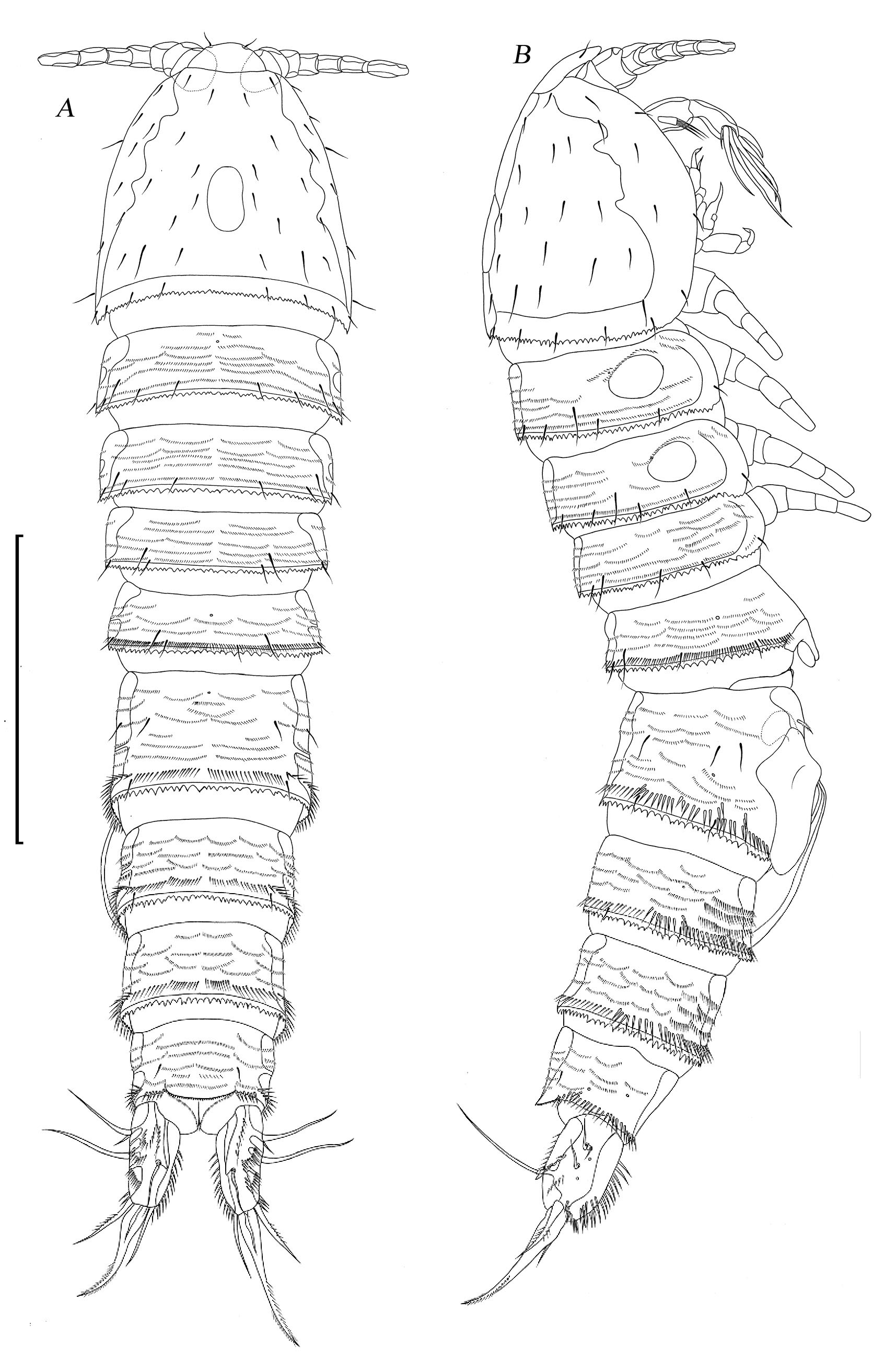 Рис. 10. Moraria (Baikalomoraria) ornofurcata sp. n., самка, внешний вид: A – дорсально, B – латерально. Масштаб 200 мкм.