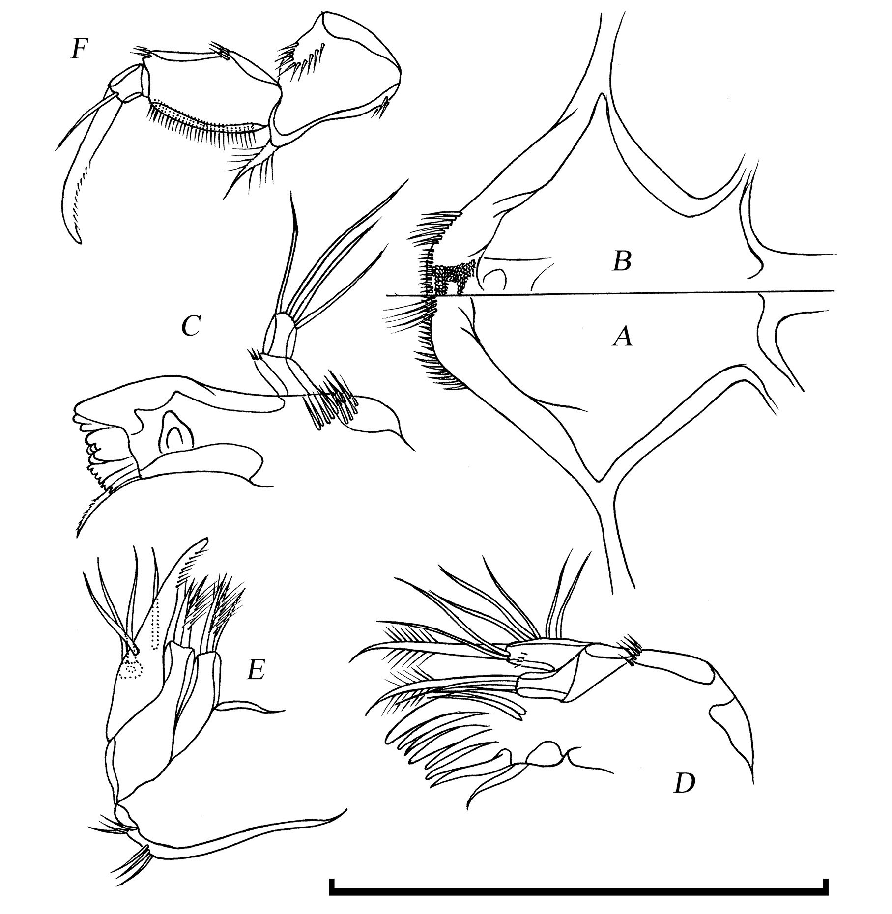 Максиллипеды (рис. 6F). Синкокса с односторонне перистой щетинкой на дистальном выступе и двумя рядами шипиков. Базис с рядом шипиков на фронтальной стороне и двумя внешними рядами маленьких шипиков. Эндоподит несет мощный коготь и щетинку.
