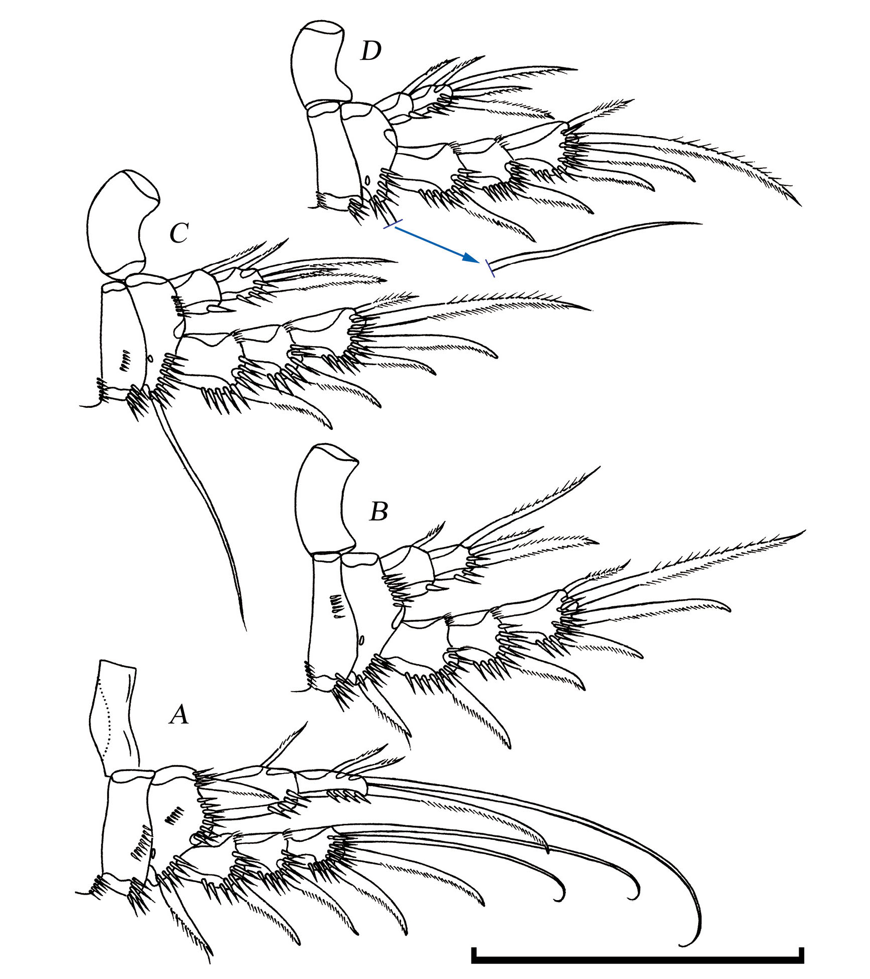 Рис. 7. Moraria (Baikalomoraria) okunevae sp. n., самка: A – P1, передняя сторона; B – P2, передняя сторона; C – P3, передняя сторона; D – P4, передняя сторона. Масштаб 100 мкм.