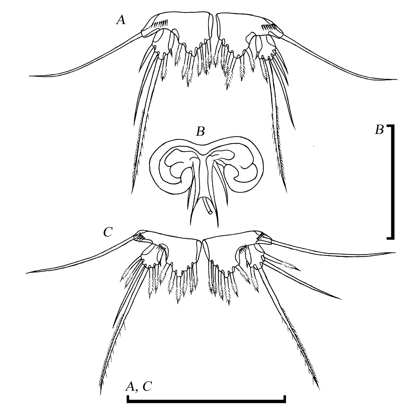 Каудальные ветви (рис. 3A–3C; 4A–4C; 14A) расширены в дорсо-вентральном направлении, по длине равны анальному сомиту, в полтора раза длиннее своей наибольшей латеральной ширины. Дорсальная сторона с продольным килем, который продолжается примерно до второй трети длины ветвей и на конце образует мощный шип, у основания которого крепится VII щетинка. На дистальном конце ветвей у основания апикальных щетинок имеется ряд шипиков с вентральной стороны. I и II щетинки расположены в конце первой четверти; III щетинка – в конце первой половины латерального края; IV щетинка немного короче каудальных ветвей и вооружена шипиками; V щетинка почти в полтора раза длиннее каудальных ветвей, вздута в основании и на конце вооружена шипиками; VI щетинка короткая и голая; VII щетинка на двойном цоколе (основании).