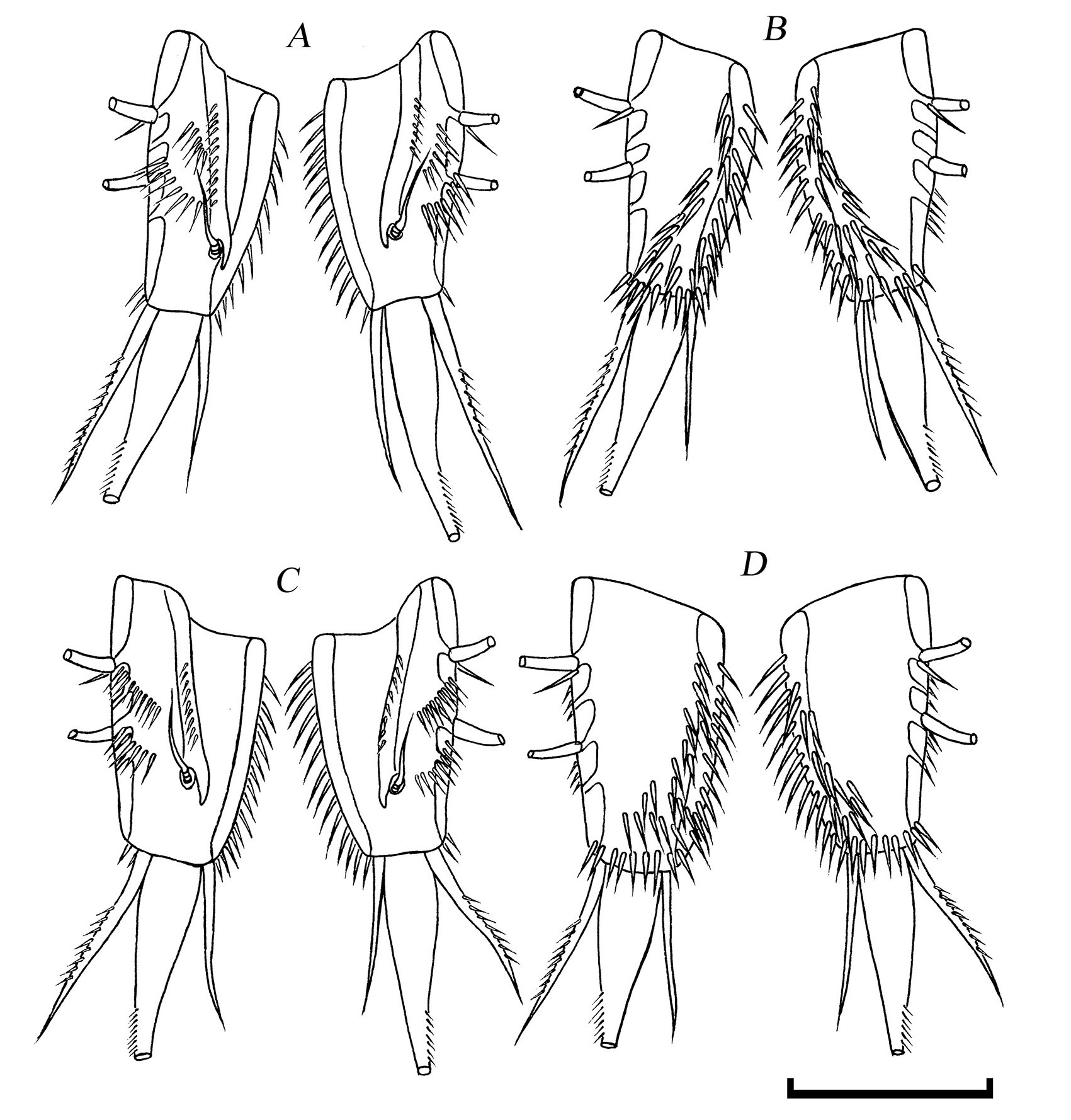 Каудальные ветви (рис. 11A–11С; 12A–12D; 14B) чуть короче анального сомита и в полтора раза длиннее своей наибольшей ширины. Дорсальная сторона с продольным килем; киль продолжается до третьей четверти длины ветвей и на конце образует мощный шип, у основания которого крепится VII щетинка. Вдоль киля идет два ряда шипиков: один из которых расположен на самом киле, а второй – с внешней стороны киля. На дистальном конце ветвей у основания апикальных щетинок имеется ряд шипиков с вентральной стороны. I и II щетинки расположены в конце первой трети латерального края; III – в конце второй трети латерального края; IV щетинка короткая и голая либо несет мелкие тонкие шипики; V щетинка в виде мощного шипа; VI щетинка короткая и голая; VII щетинка на двойном цоколе.