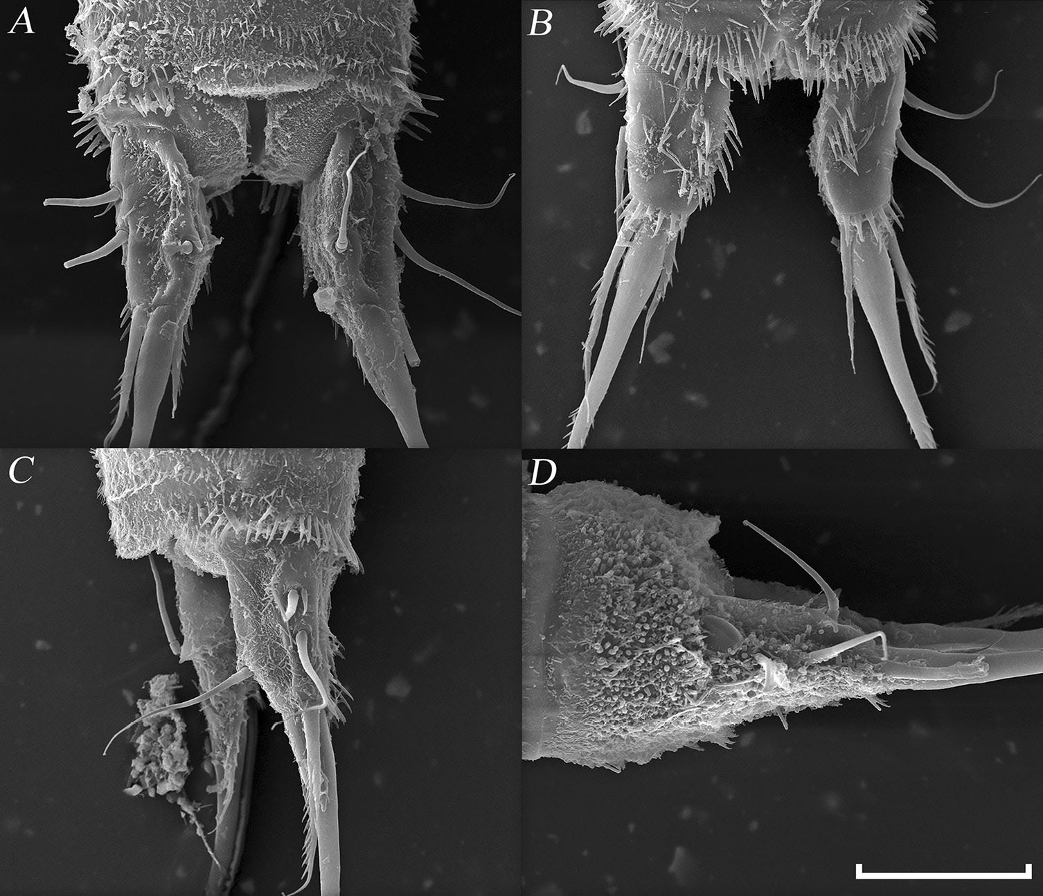 Рис. 12. Moraria (Baikalomoraria) ornofurcata sp. n., СЭМ-фотографии каудальных ветвей самки: A – дорсально; B – вентрально; C, D – латерально. Масштаб 50 мкм.