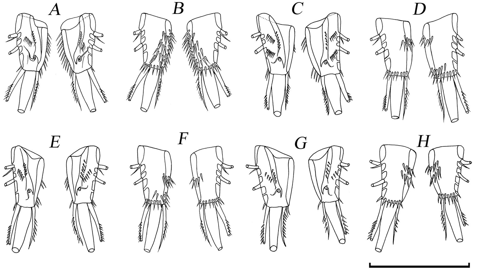 Рис. 13. Moraria (Baikalomoraria) ornofurcata sp. n., каудальные ветви самок дорсально (A, C, E, G) и вентрально (B, D, F, H): A, B – паратип № 1; C, D – паратип № 2; E, F – паратип № 3; G, H – паратип № 5. Масштаб 100 мкм.