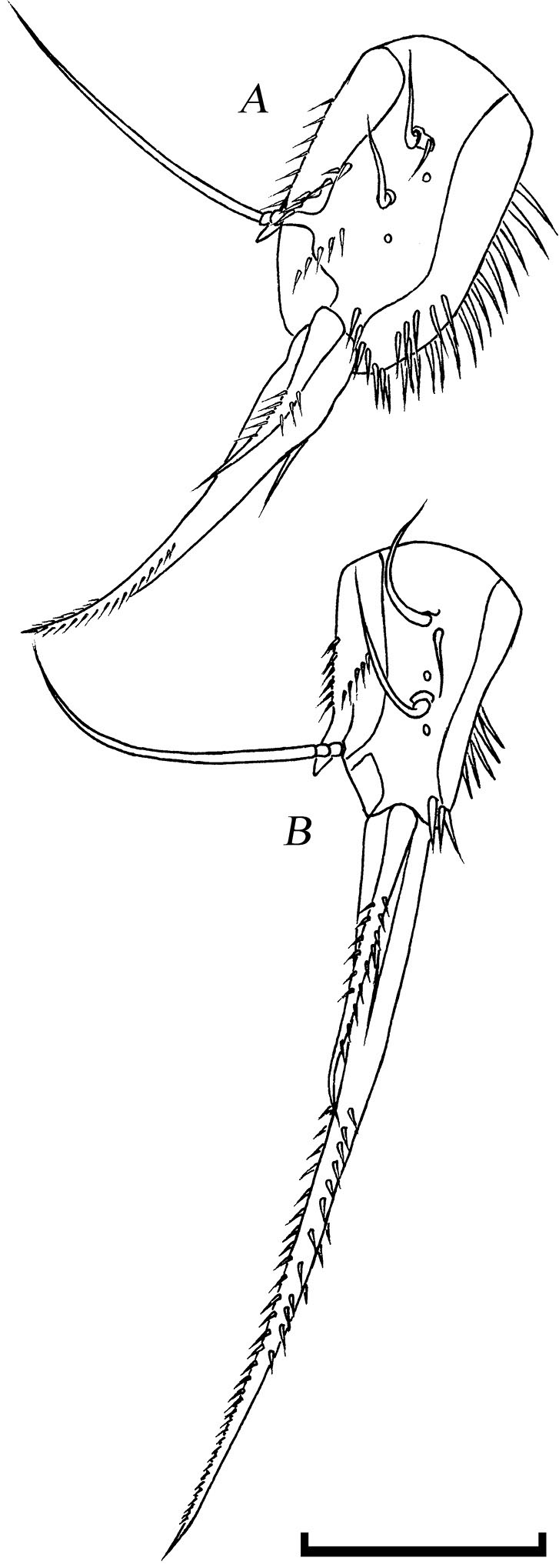 Р2 (рис. 7B). Интеркоксальный склерит вогнутый. Прекокса с рядом шипиков. Кокса прямоугольная, с рядами шипиков на внешнем крае и на передней стороне. Базис с внешним шипом, двумя рядами шипиков у основания шипа и эндоподита и одной по́рой. Экзоподит трехсегментный, каждый сегмент с рядом шипиков, который идет от внешнего к переднему дистальному краю; проксимальный и медиальный сегменты с шипом на внешнем дистальном углу; дистальный сегмент с четырьмя элементами (два внешних шипа, апикальная и внутренняя щетинки). Эндоподит двухсегментный; проксимальный сегмент со щетинкой на внутреннем крае и шипиком на внешнем крае; дистальный сегмент с рядом шипиков на внешнем крае и тремя элементами (три апикальные щетинки).