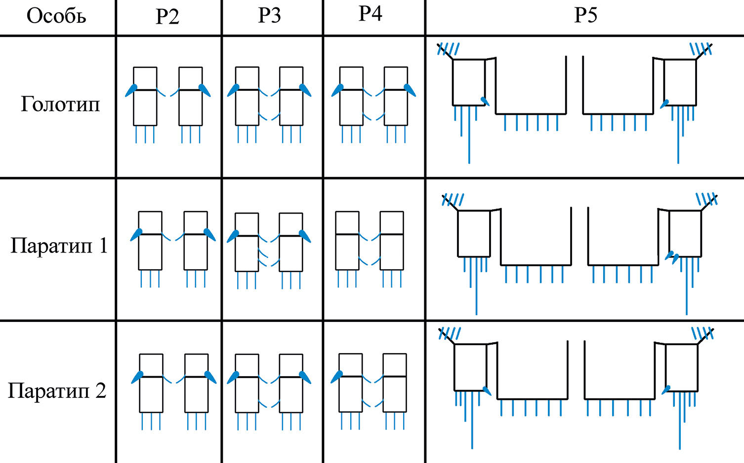 Изменчивость. На внешней стороне проксимального сегмента одного из эндоподитов P2 у паратипов № 1 и 3 вместо одного крупного шипа есть три тонких шипика. Количество внутренних щетинок на дистальном сегменте эндоподитов P3 и P4 варьирует от одной до двух. У голотипа и паратипа № 4 проксимальный и дистальный сегменты одного из эндоподитов P4 срощены. Количество внешних шипиков на проксимальных сегментах эндоподитов P2–P4 может меняться от одного мощного шипика до трех более мелких. Количество элементов вооружения экзоподита P5 варьирует от трех до шести: один-два внутренних шипа (могут отсутствовать); две апикальные щетинки; один-два внешних шипа. Вооружение каждой пары эндоподитов P2–P5 часто является разным у одной особи. Подробно изменчивость строения плавательных ног представлена на рис. 16. Дополнительное вооружение каудальных ветвей у особей типовой серии варьирует (рис. 13A–13H). На дорсальной стороне ветвей у паратипа № 2 есть три ряда шипиков вместо двух. На вентральной стороне ветвей паратипов № 2, 3 и 5 количество шипов значительно меньше, чем у остальных особей.