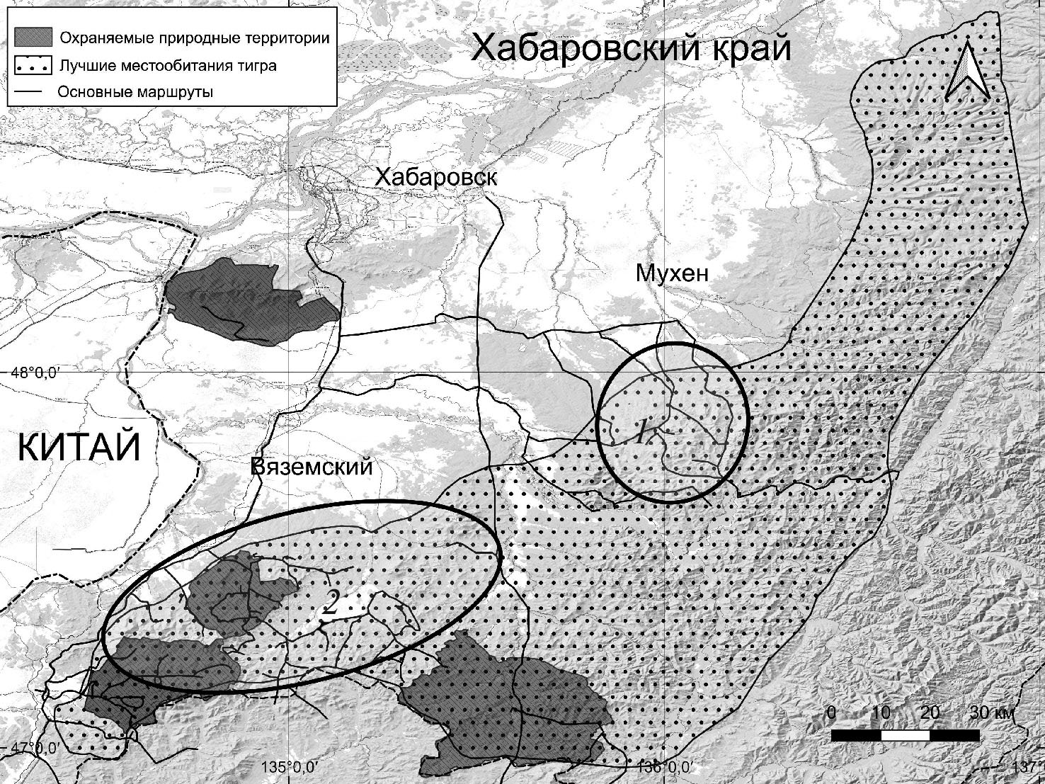 Участок исследований. В Хабаровском крае основные местообитания тигра сосредоточены на западном макросклоне Сихотэ-Алиня в бассейнах рек Анюй (нижнее и среднее течение), Пихца, Дурмин, Обор, Немта, Мухен, Кия, Подхоренок, Бира, бассейне среднего течения реки Хор с его притоками (рис. 2). В бассейне р. Гур, на восточном макросклоне Сихотэ-Алиня, а также на левобережье Амура тигр значительно более редок. Фактически изолированной от основной части ареала территорией, которую населяет тигр в Хабаровском крае, является хребет Хехцир (Ткаченко, 1996). Но этот отделенный от Сихотэ-Алиня открытыми равнинными пространствами и дорогами участок, который в последние годы населяют два-три взрослых тигра (Андронов и др., 2018), не может играть существенную роль в поддержании стабильности группировки тигра в Хабаровском крае. Определяющее значение для сохранения этого вида в исследуемом регионе имеет область, расположенная в предгорьях западного макросклона Центрального Сихотэ-Алиня (к юго-востоку от Среднеамурской низменности), где сосредоточена единая жизнеспособная группировка тигра вне ООПТ федерального значения (рис. 2).
