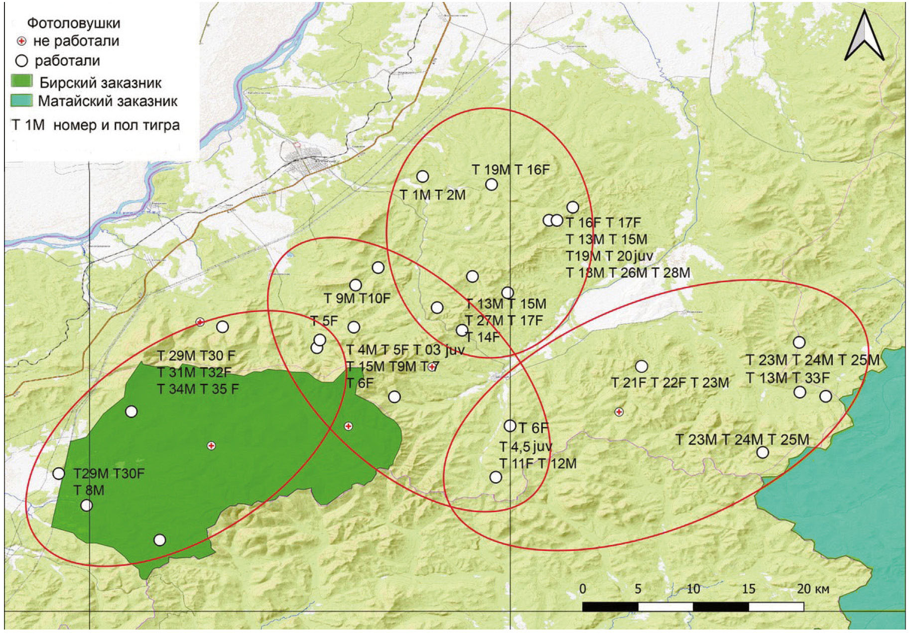 Результаты фотоучета. На Вяземском участке за период с декабря 2021 г. по май 2022 г. отработано 2678 фотоловушко/суток, получено 211 фоторегистраций тигра, которые принадлежат 35 особям: 12 взрослым самцам, четырем молодым самцам в возрасте около двух лет, трем особям неопределенного пола, девяти взрослым самкам, трем молодым самкам в возрасте около двух лет, двум детенышам в возрасте около семи–девяти месяцев, двум детенышам в возрасте четырех–пяти месяцев (рис. 3, табл. 1). На основе этих данных и наблюдений по следам мы условно выделили четыре репродуктивных ядра, каждое из которых включало не менее одной-двух размножающихся самок и одного-двух взрослых самцов. Кроме них здесь же присутствовали тигрята текущего и предыдущего выводков, а также временно заходящие молодые кочующие самцы (рис. 3).