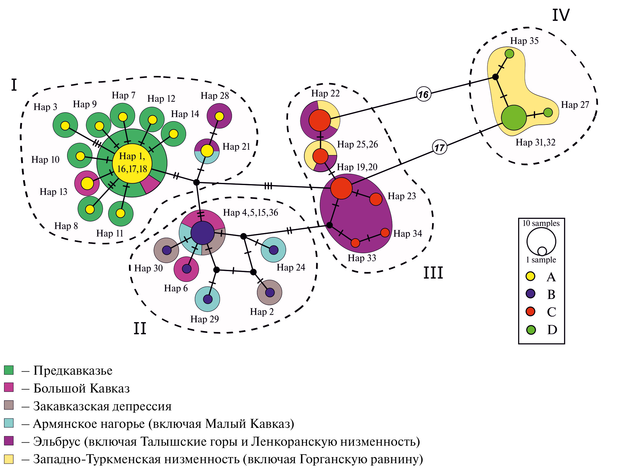 Рис. 1. Пункты сбора экземпляров Lacerta strigata, использованных для молекулярно-генетического анализа. Митохондриальные клады: А – желтые, B – синие, C – красные, D – зеленые. Белым цветом обозначен локалитет (№ 32), откуда имеется только последовательность β-fib. Нумерация и буквенные обозначения соответствуют таковым в табл. 1.