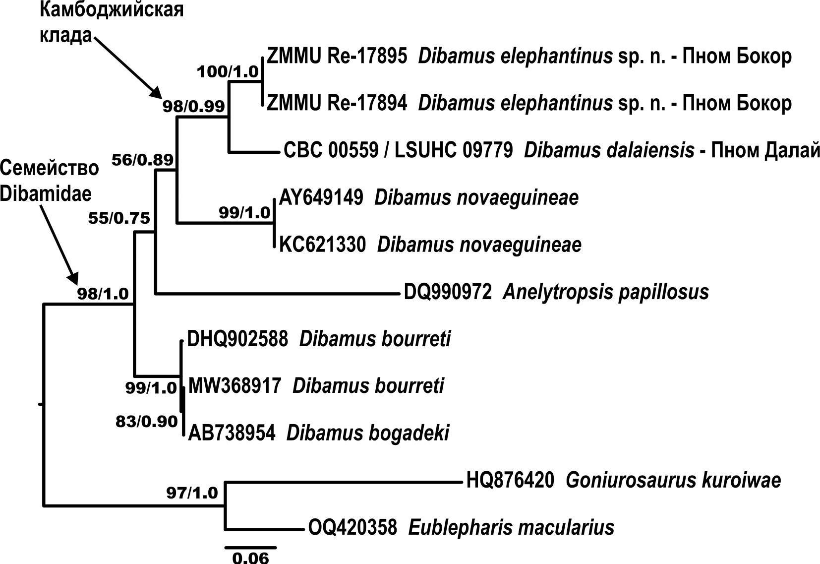 Два экземпляра с Филиппинских островов, определенных как D. novaeguineae Duméril et Bibron, 1839, образуют самостоятельную кладу (99/1.0). Наконец, три экземпляра Dibamus spp. из Камбоджи группируются в хорошо поддержанную кладу (Камбоджийская клада на рис. 2, 98/0.99), включающую две обособленные мтДНК-линии, одна из которых представлена единственным экземпляром D. dalaiensis, обнаруженным на горе Пном Далай в западной части Кардамоновых гор (провинция Пурсат), а вторая – двумя экземплярами Dibamus sp., найденными на горе Пном Бокор в южной части Слоновьих гор (провинция Кампот; 100/1.0).