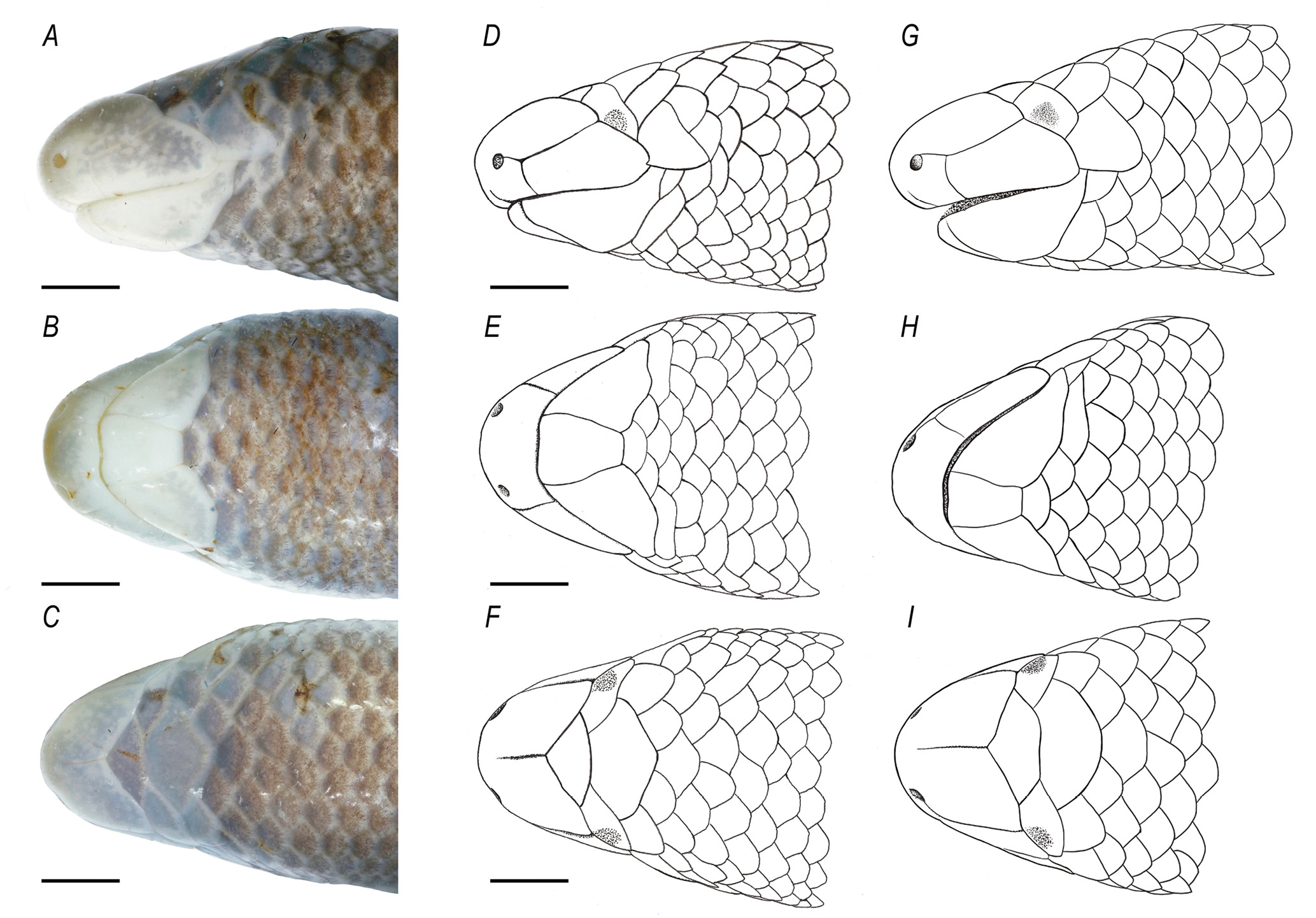 Рис. 4. Фотографии головы (A–С) и схема фолидоза (D–F) голотипа Dibamus elephantinus sp. n. (ZMMU Re-17894, самец); схема фолидоза голотипа D. dalaiensis (G–I) (LSUHC09777, по Neang et al., 2011). Голова показана сбоку (A, D, G), с дорсальной (B, E, H) и с вентральной (C, H, I) сторон. Масштаб 1 мм. Фотографии A–С и рисунки фолидоза (D–I) выполнены Клюкиным Н. С.