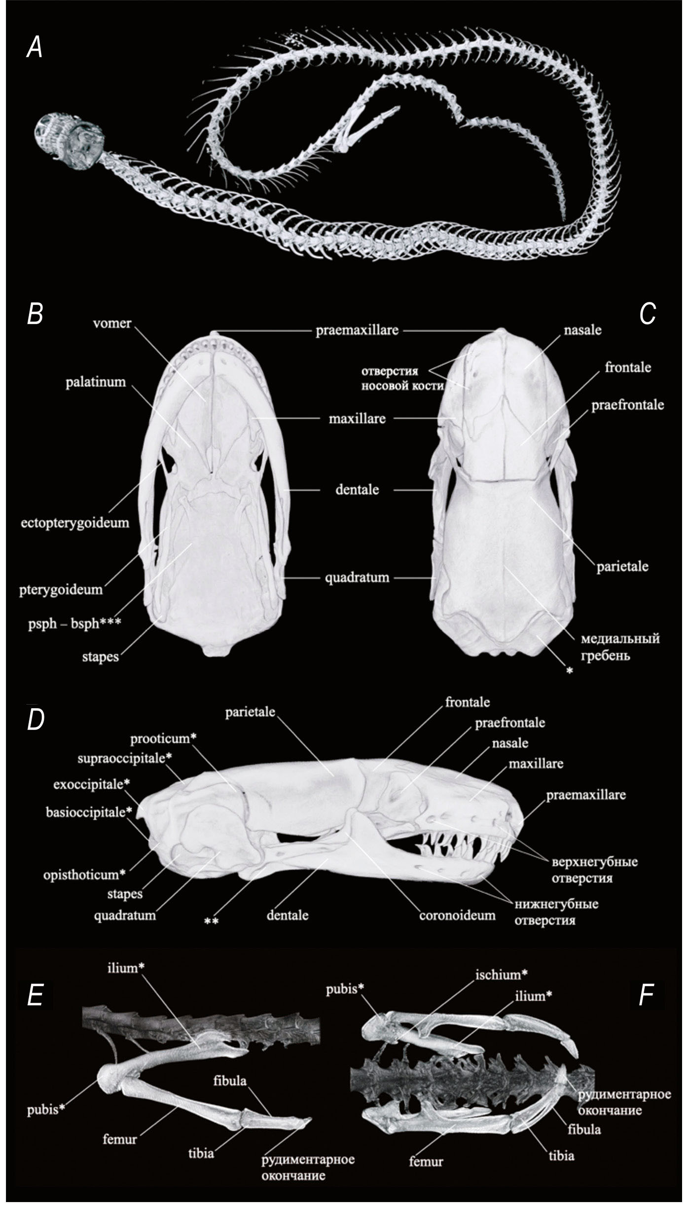 Остеология. Для одного экземпляра червеобразных ящериц (ZMMU Re-17894, самец) была получена 3D-реконструкция скелета при помощи микротомографа Bruker Skyscan 1272 (США), оснащенного источником Hamamatsu L10101–67 (Hamamatsu Photonics, Хамамацу, Япония) и камерой Ximea xiRAY16 (Ximea GmbH, Мюнстер, Германия) на базе центра компьютерной микротомографии Биологического факультета МГУ. Образец сканировали при напряжении источника 65 кВ и силе тока 150 мкА без рентгеновского фильтра. Экземпляр поворачивали на 180° вокруг вертикальной оси с шагом 0.1°. На основе полученных рентгеновских проекций с помощью программного обеспечения NRecon® (Bruker micro-CT, Kontich, Бельгия) были реконструированы стеки виртуальных поперечных сечений скелета исследованного экземпляра. Итоговый стек состоял из 2963 изображений с разрешением 4904x4904 и размером пикселя 2.02 мкм. Трехмерную визуализацию и последующий анализ остеологических признаков проводили в пакете программного обеспечения Avizo 8.1. Номенклатура окостенений червеобразных ящериц дана в соответствии с работами Грира (Greer, 1985), Риппеля (Rieppel, 1984) и Клюкина с соавторами (Kliukin et al., 2023, 2024).