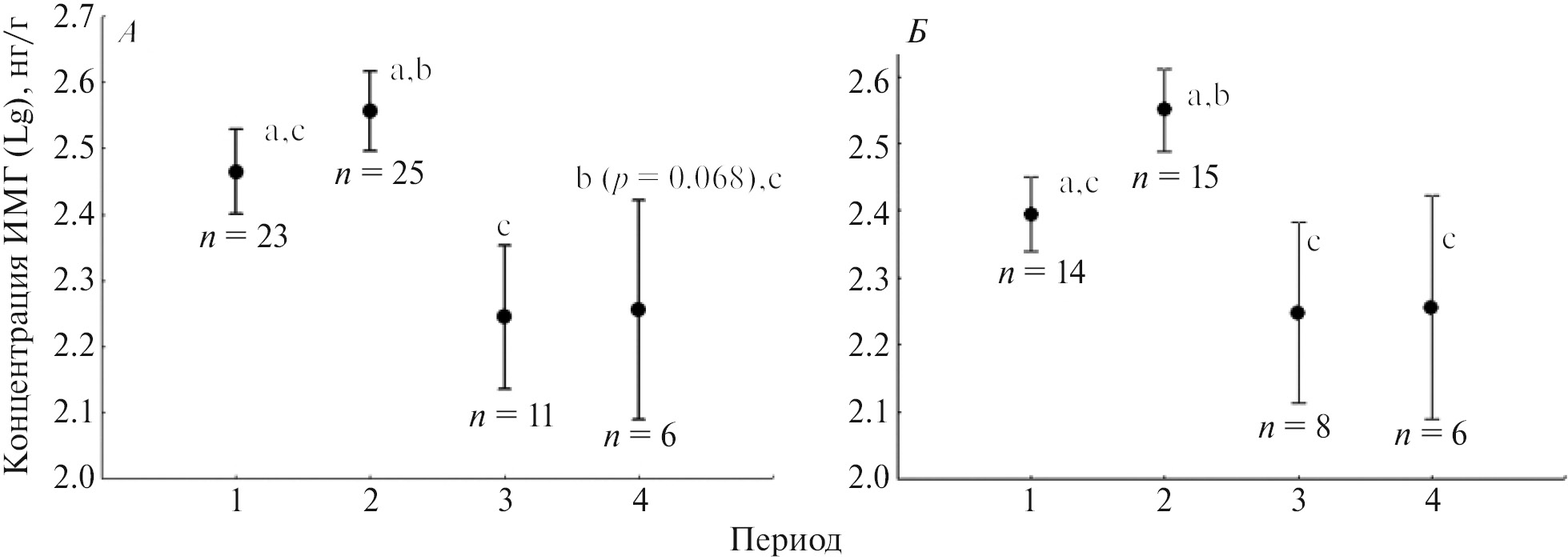 Поскольку значимые различия между полами в уровне ИМГ среди взрослых и среди молодых отсутствовали на каждом из этапов исследования (тест Манна-Уитни, p > 0.05) и выборки были ограниченного размера, анализ динамики уровня ИМГ был проведен без разделения по полу сначала для всей выборки (взрослые и молодые) и затем отдельно для сравнительно многочисленной выборки молодых особей.