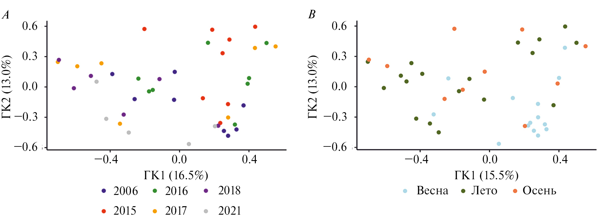 Рис. 3. Показатели бета-разнообразия изучаемых сообществ диплопод по индексу несходства Брея–Кертиса: А – в разные годы, B – в разные сезоны года. Результаты статистического анализа показателей бета-разнообразия отображены в Табл. 3.