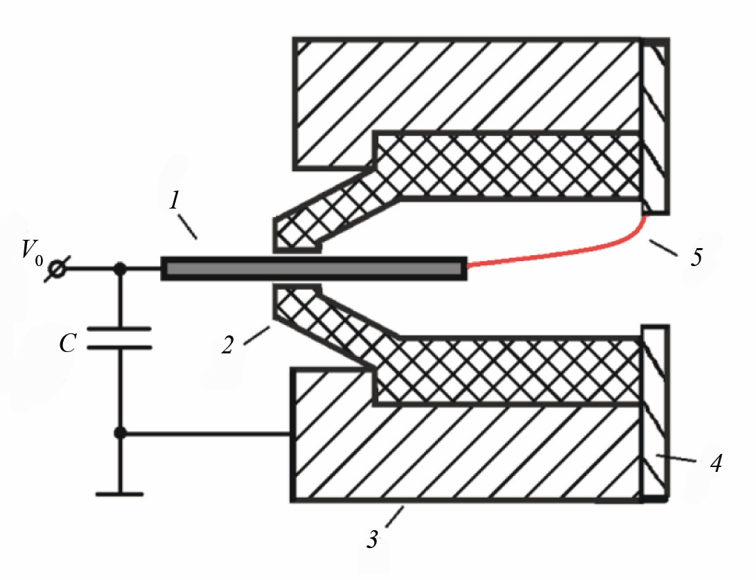 Рис. 1. Упрощенная схема ГЭАП: 1 — острийный электрод; 2 — изолятор; 3 — обратный электрод (токопровод); 4 — мембрана (дисковый электрод); 5 — схематичное положение канала разряда