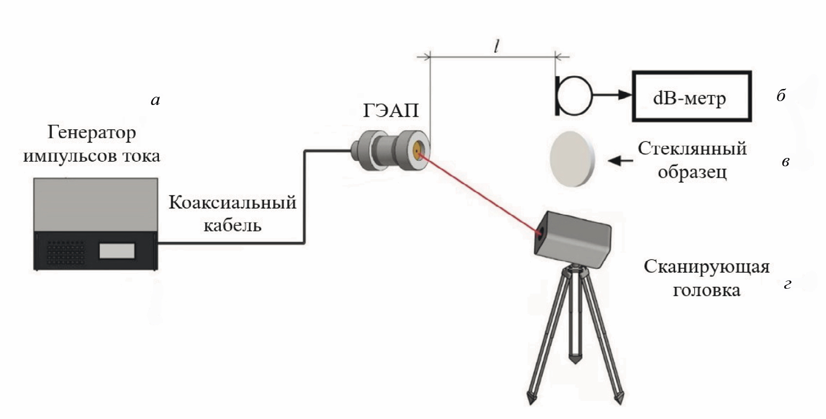 Рис. 2. Упрощенная схема лабораторной установки для исследования ГЭАП: а — система для возбуждения акустических колебаний на основе ГЭАП; б — измеритель уровня звукового давления; в — образец для исследования напыления; г — сканирующая головка лазерного виброметра (l — расстояние до торца преобразователя)