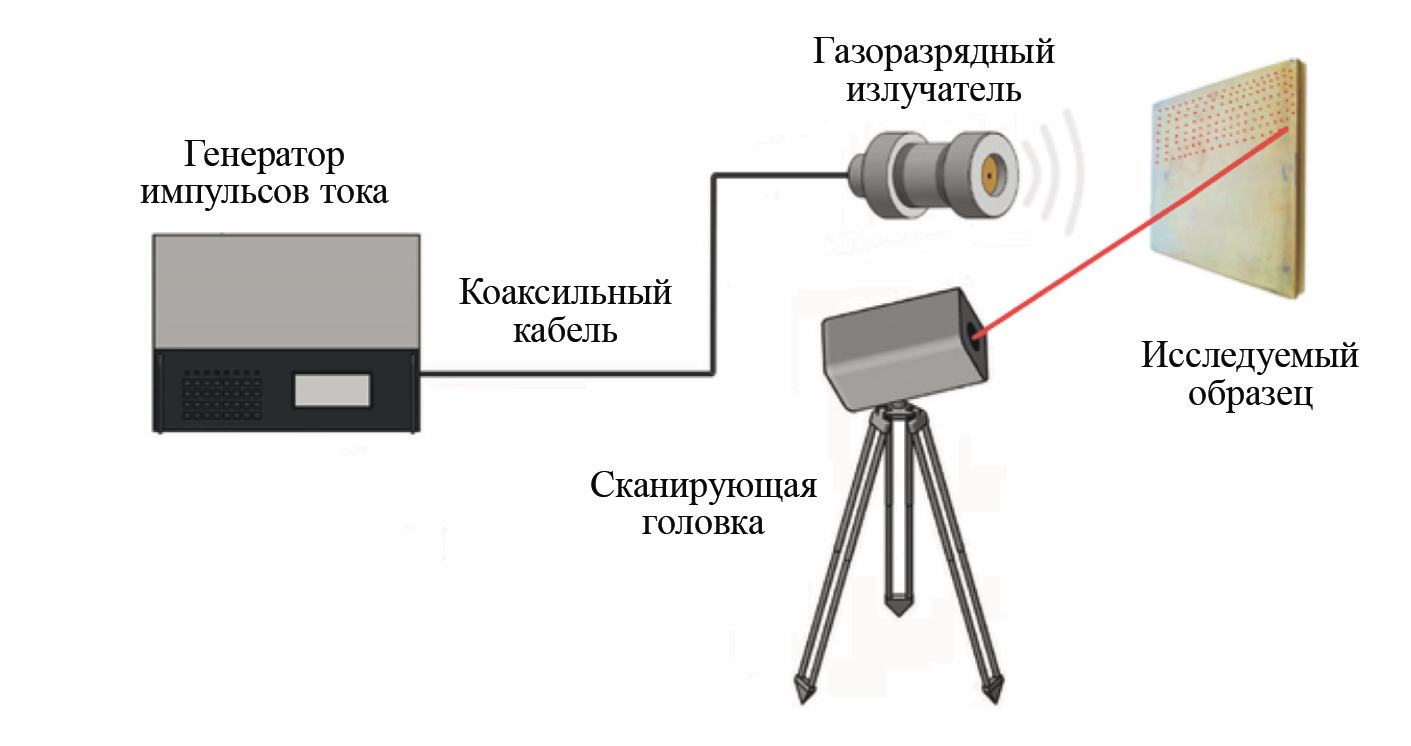 Рис. 3. Упрощенная схема лабораторной установки для проведения НК с использованием сканирующей лазерной доплеровской виброметрии и бесконтактного способа стимуляции материалов на основе ГЭАП