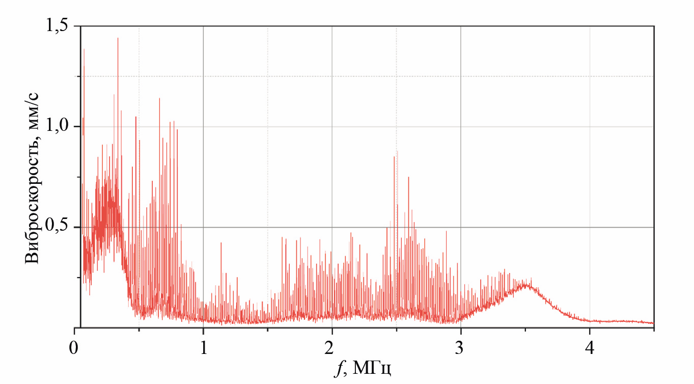 C помощью метода лазерной виброметрии проведен спектральный анализ колебаний в пяти точках на мембране излучателя (количество измерений — 5). Время записи колебаний в каждой точке сканирования составило 4 мс при длительности релаксации колебаний мембраны около 2 мс [22]. В ходе лазерного сканирования был измерен амплитудно-частотный спектр колебаний мембраны ГЭАП в диапазоне частот от 100 кГц до 4 МГц с разрешением 30 Гц. На рис. 4 приведен амплитудно-частотный спектр ГЭАП, имеющего отверстие диаметром 1 мм в центре мембраны.