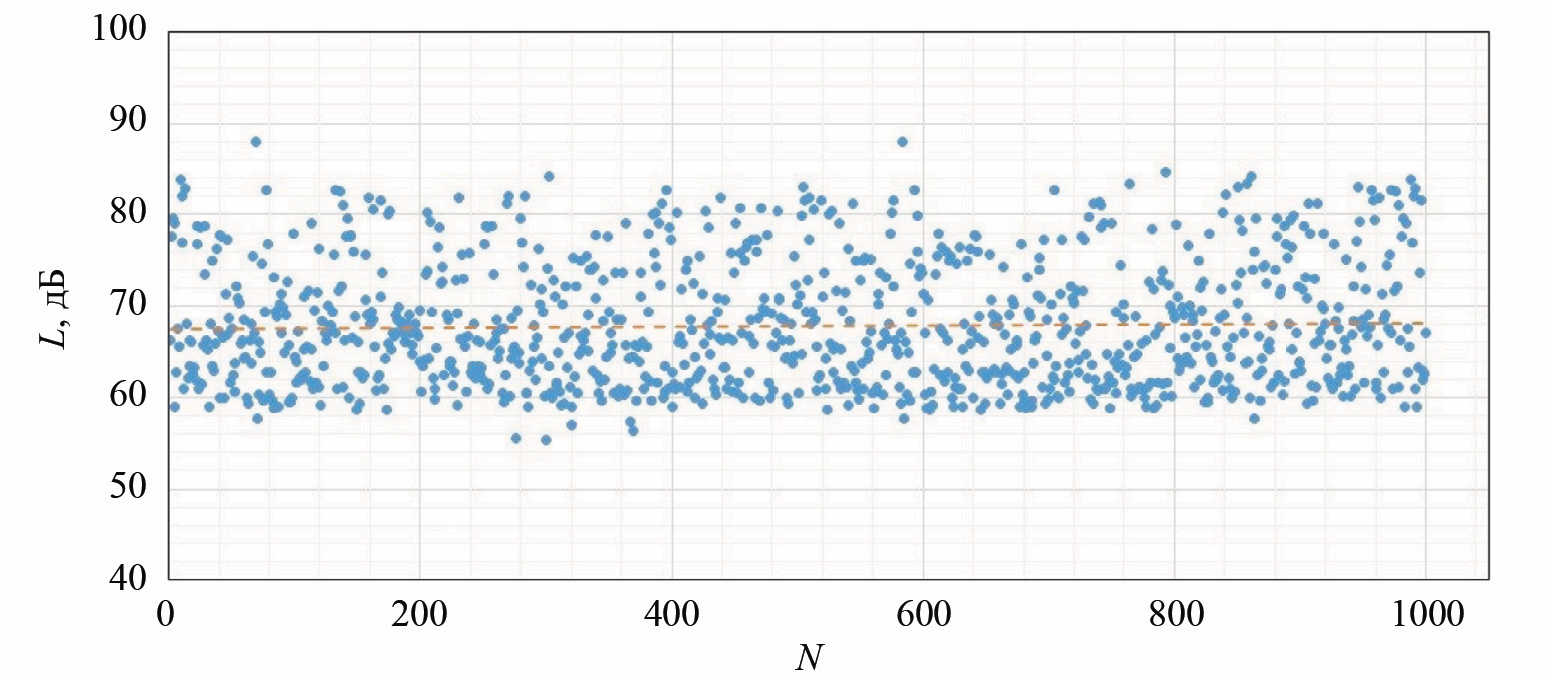 Судя по графику (см. рис. 5), от импульса к импульсу наблюдаются существенные изменения амплитуды звукового давления (разброс от 60 до 90 дБ). В некоторых случаях была достигнута амплитуда звукового давления более 85 дБ, что соответствует перепаду давления в области измерения на уровне 0,2 Па в полосе частот до 8 кГц. При этом, с учетом данных о распределении спектральной плотности мощности (см. рис. 4), суммарный перепад давления будет еще выше. Вероятно, нестабильность амплитуды сигнала связана со спецификой газоразрядных процессов, например, с различной длиной и положением разрядного канала, что также было отмечено в работе [38]. В связи с этим при использовании акустических преобразователей газоразрядного типа необходимо учитывать разброс амплитуды сигнала.