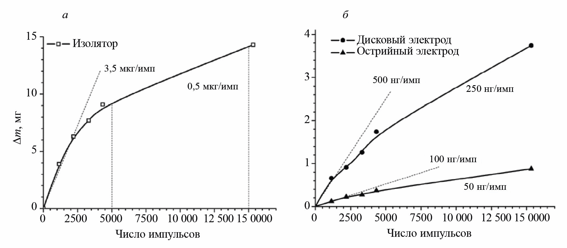Максимальная скорость уноса массы изолятора составляла (0,5—3,5) мкг/имп, что превышает соответствующие значения уноса массы электродов (рис. 7б). Полученный результат, вероятно, объясняется механическим разрушением, испарением и распылением с последующим уносом продуктов этих реакций из объема электродной системы ГЭАП. По мере выхода на режим скорость потери массы изолятора стабилизировалась на уровне 500 нг/имп.