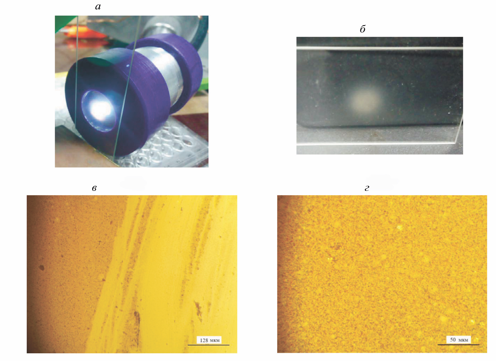 Напротив выходного отверстия, вплотную к выходному отверстию ГЭАП, размещали предварительно очищенную стеклянную подложку (схематично показанную как позиция в на рис. 2). На рис. 8а приведена фотография электроакустического преобразователя со стеклянной подложкой для улавливания напыления, на рис. 8б — фотография области напыления на стеклянной подложке по истечении 1000 импульсов.