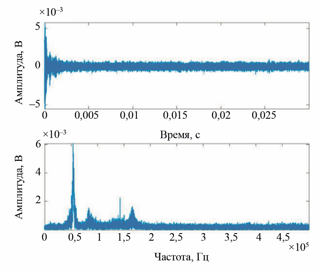 Рис. 7. Амплитуда сигнала, полученного на образце из алюминиевого сплава 6061, во временной и частотной областях после обработки методом ГАВР—КРКА