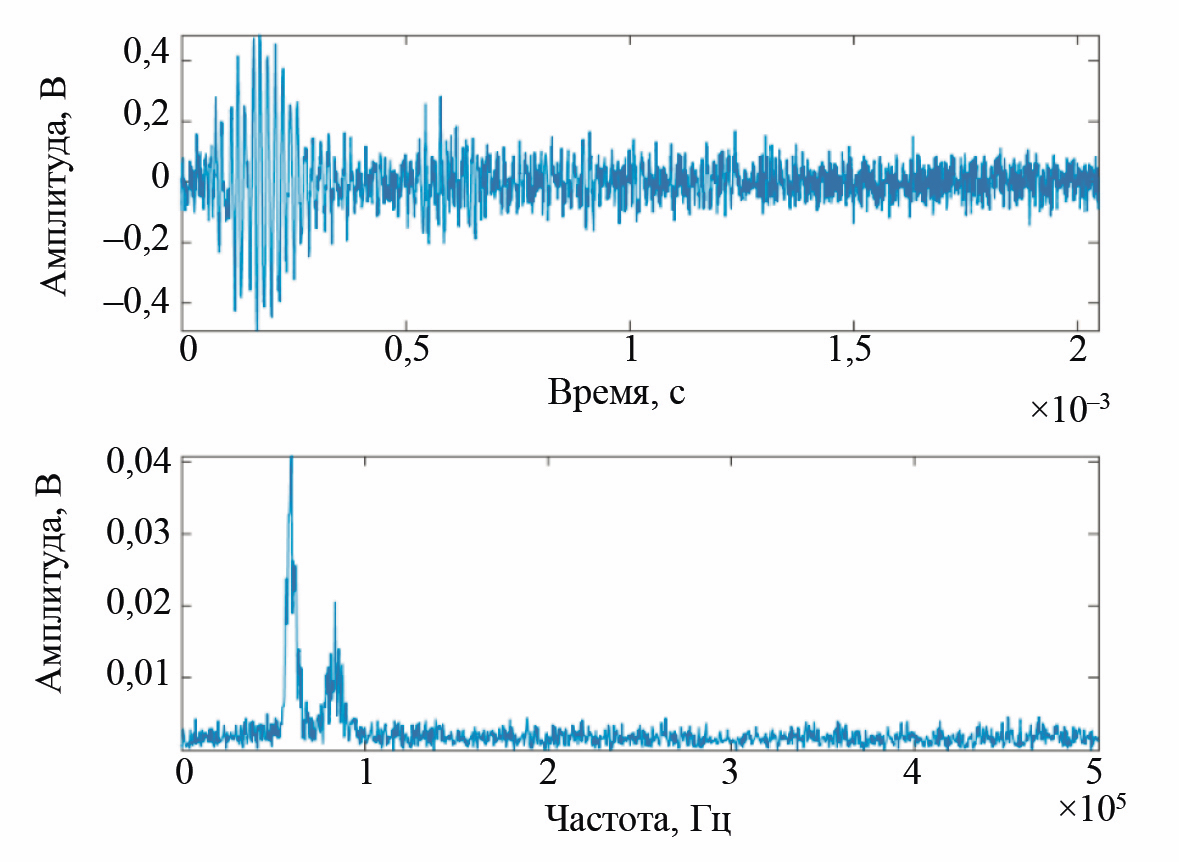 Рис. 5. Амплитуда сигнала, полученного на образце из алюминиевого сплава 6061, во временной и частотной областях