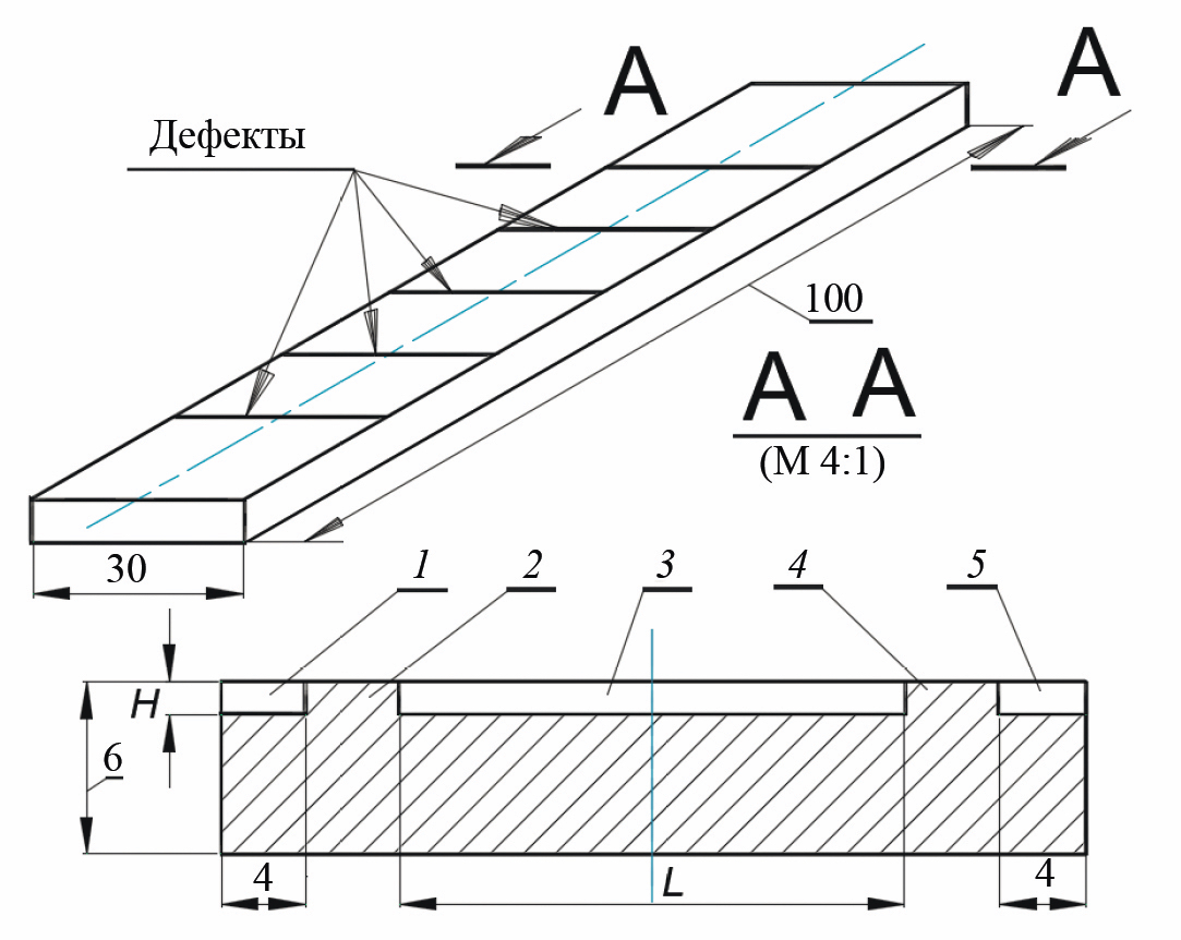 Контрольный образец изготавливают из нержавеющей стали в виде прямоугольной металлической пластины с рядом исходных поперечных дефектов одинаковой глубины H, которые выходят на края образца (рис. 1) [9]. По длинам каждого из дефектов дополнительно выполняют перемычки 2 и 4, разделяя их на ряд других, более мелких дефектов необходимой длины. На таком контрольном образце обеспечиваются как замкнутость полостей основных дефектов 3 (их края не выходят на боковые поверхности образца), так и возможность точного измерения глубин на дополнительных боковых дефектах 1 и 5, выходящих на края образца, с помощью оптического микроскопа с точностью до ±0,01 мм.